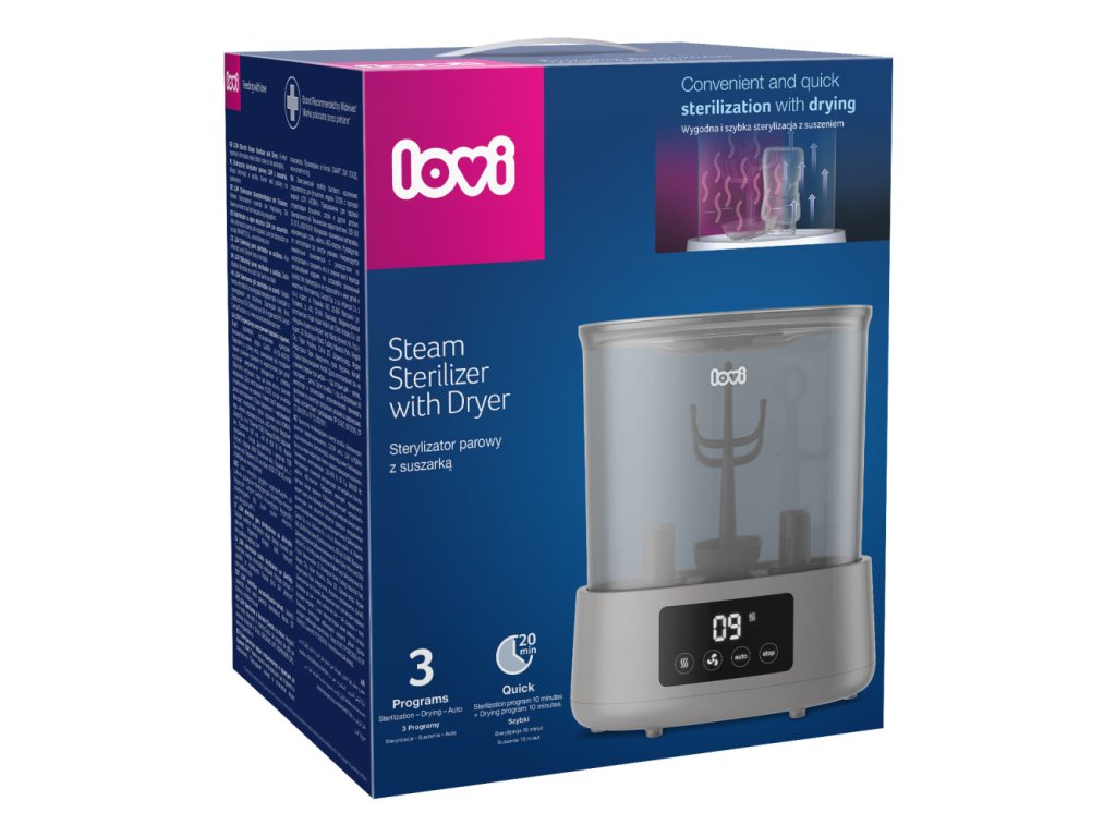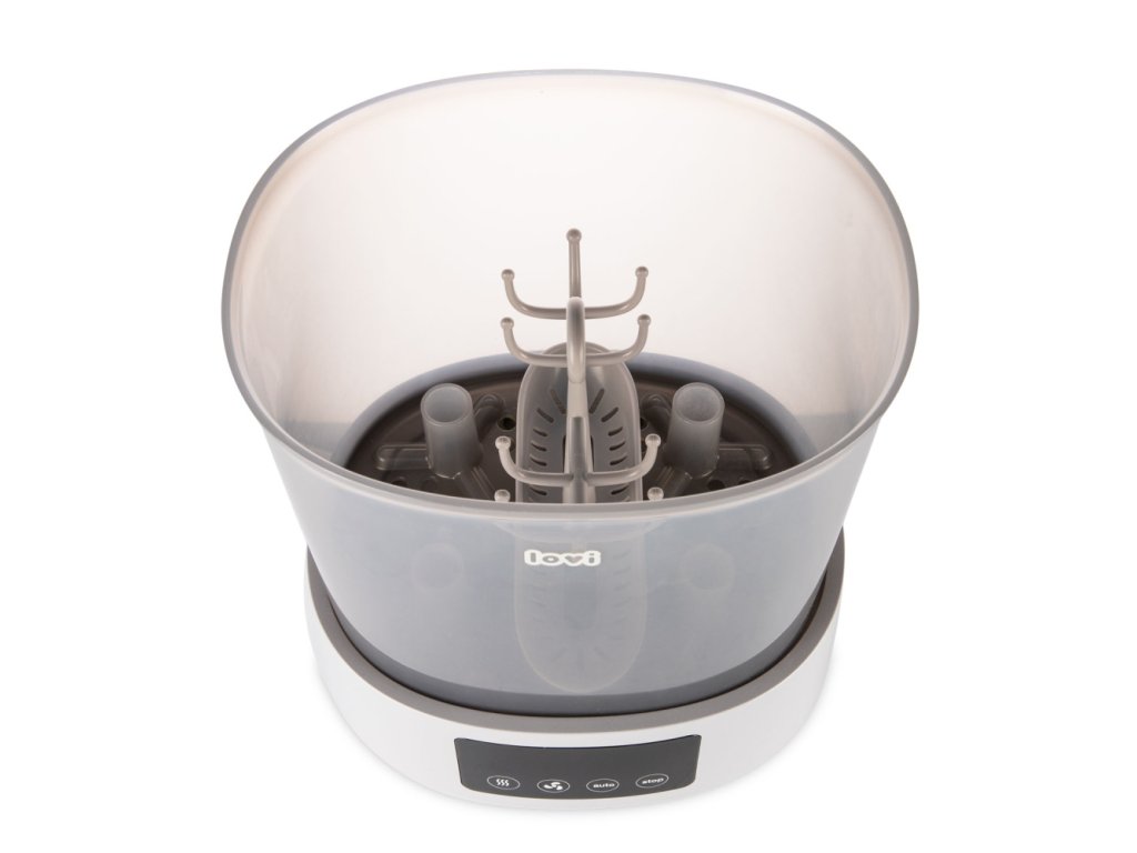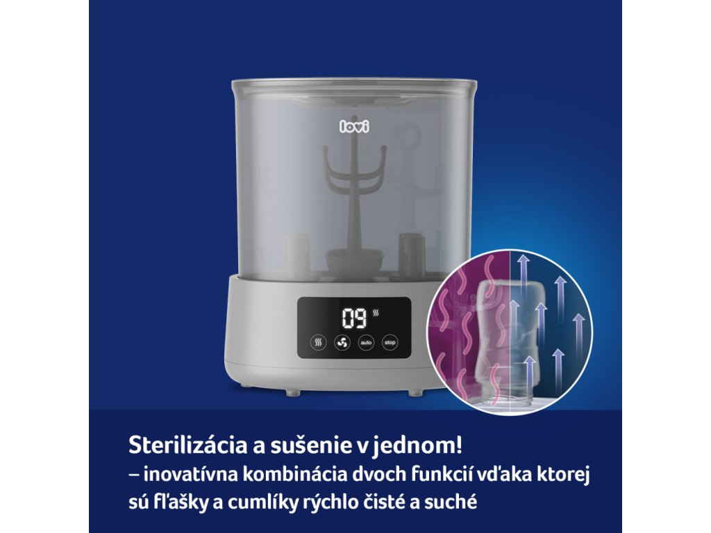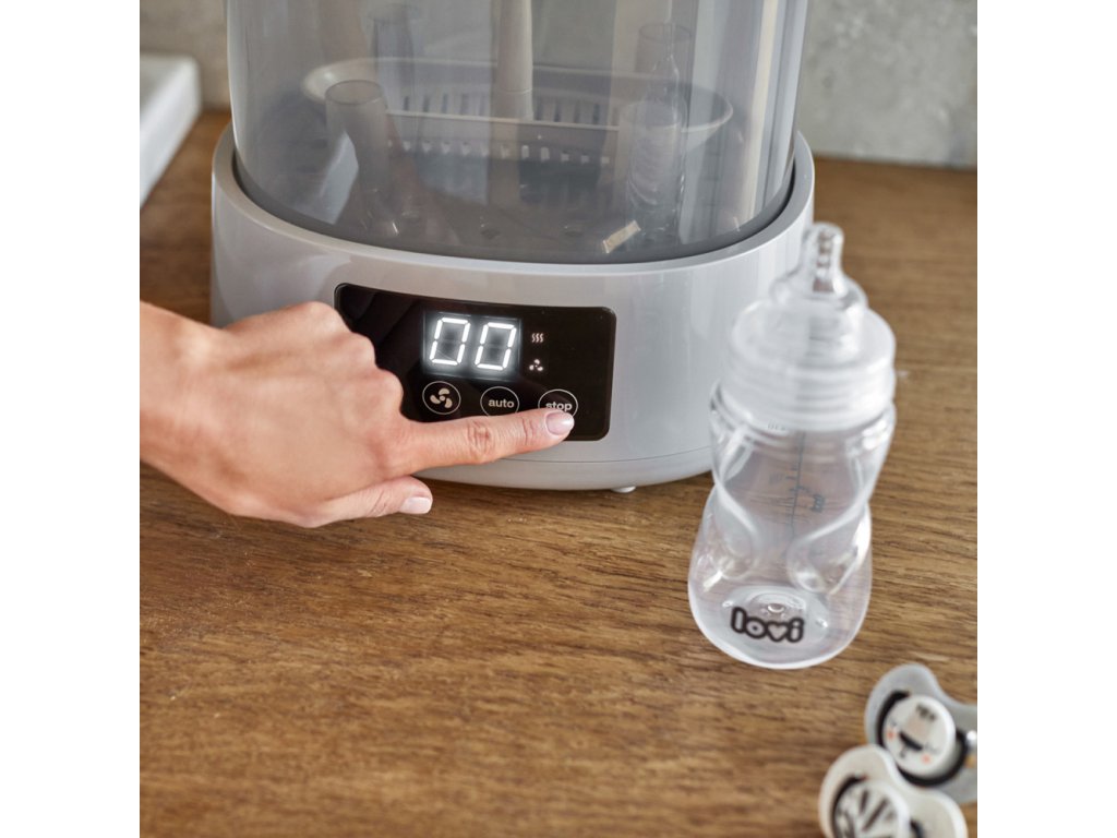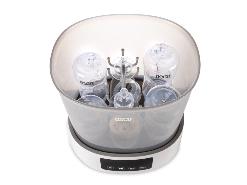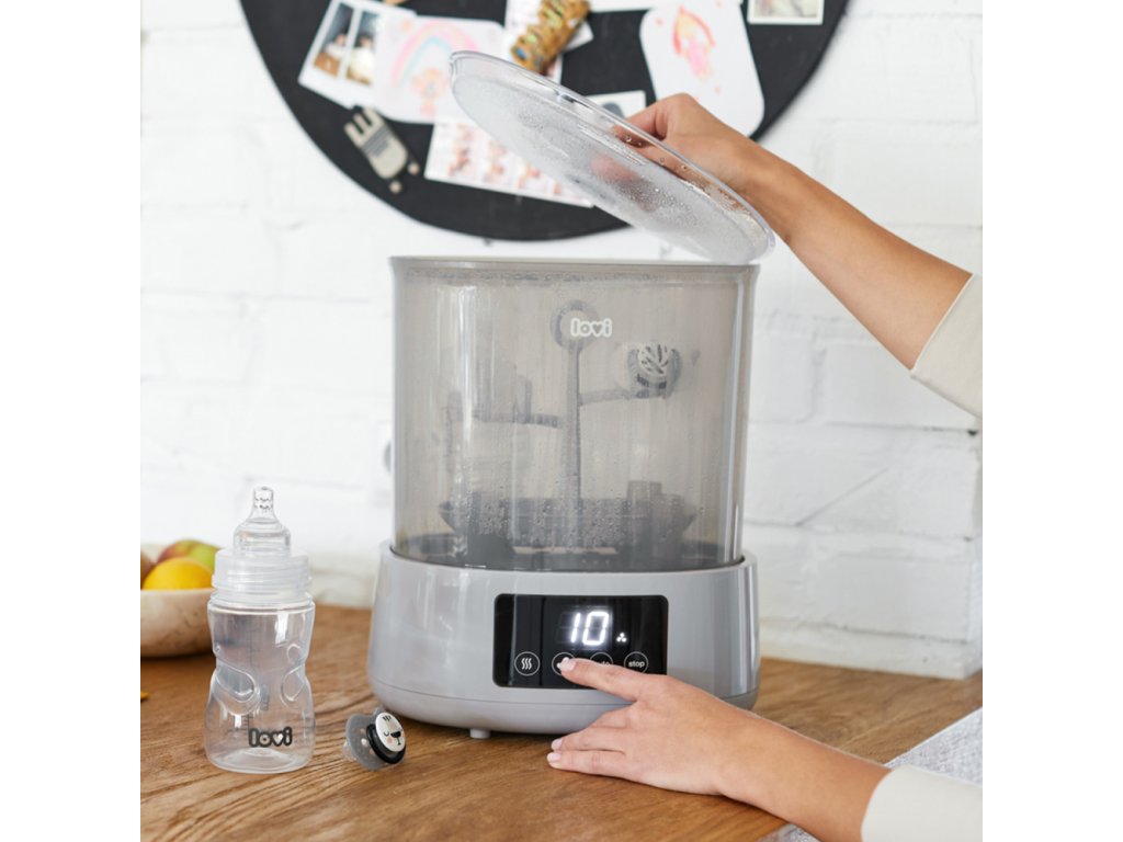 Hatékony és praktikus újdonság a LOVI márka portfóliójában - Sterilizáló szárítóval, amely rendkívül kényelmes és gyors. A sterilizáló és a szárító kombinációja egyedülálló megoldás a piacon, és nagy segítség az anyukáknak a mindennapi életben. A sterilizáló nemcsak sterilizál, hanem szárítja is a cumisüvegeket és egyéb tartozékokat. Akár 3 program egyetlen eszközben, aminek köszönhetően a cumisüvegeket és egyéb tartozékokat sterilizálja, szárítja és biztonságosan biztosítja, hogy 20 perc alatt újra használhatók legyenek.