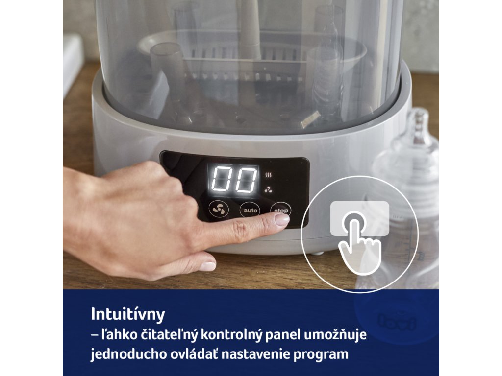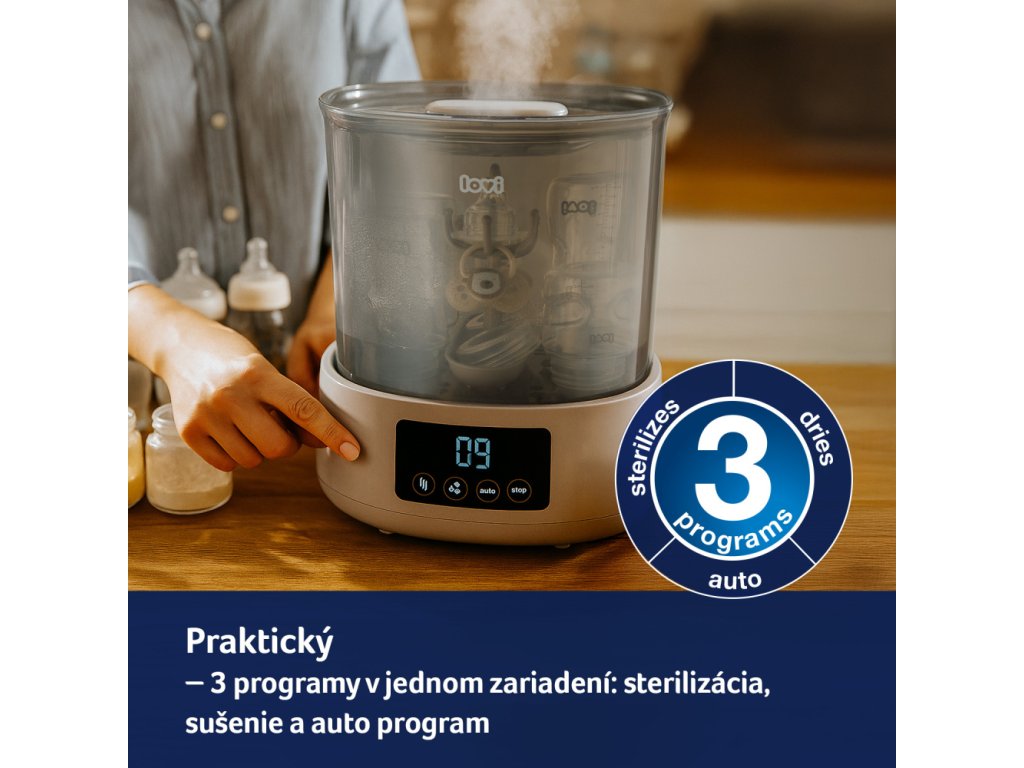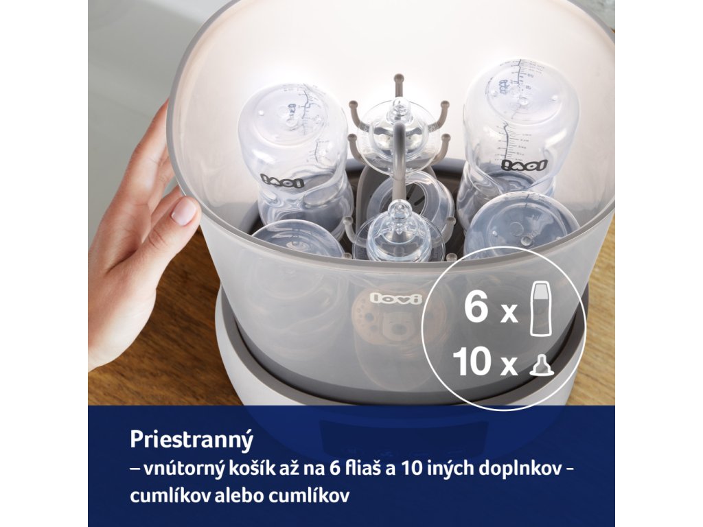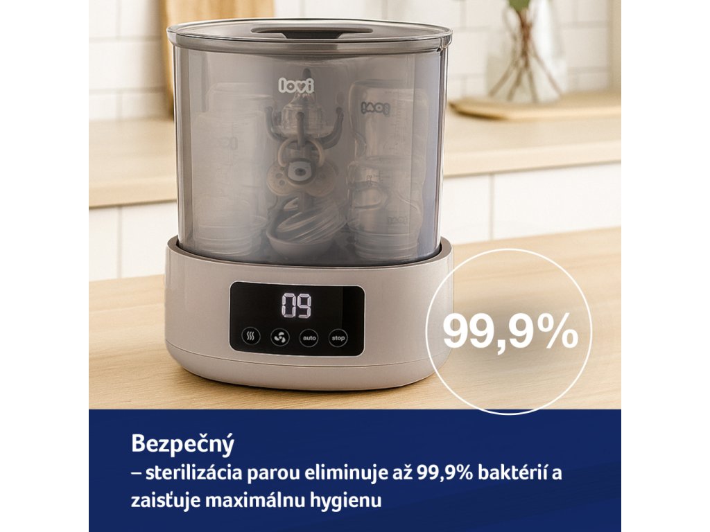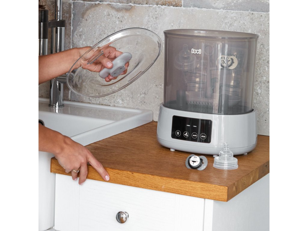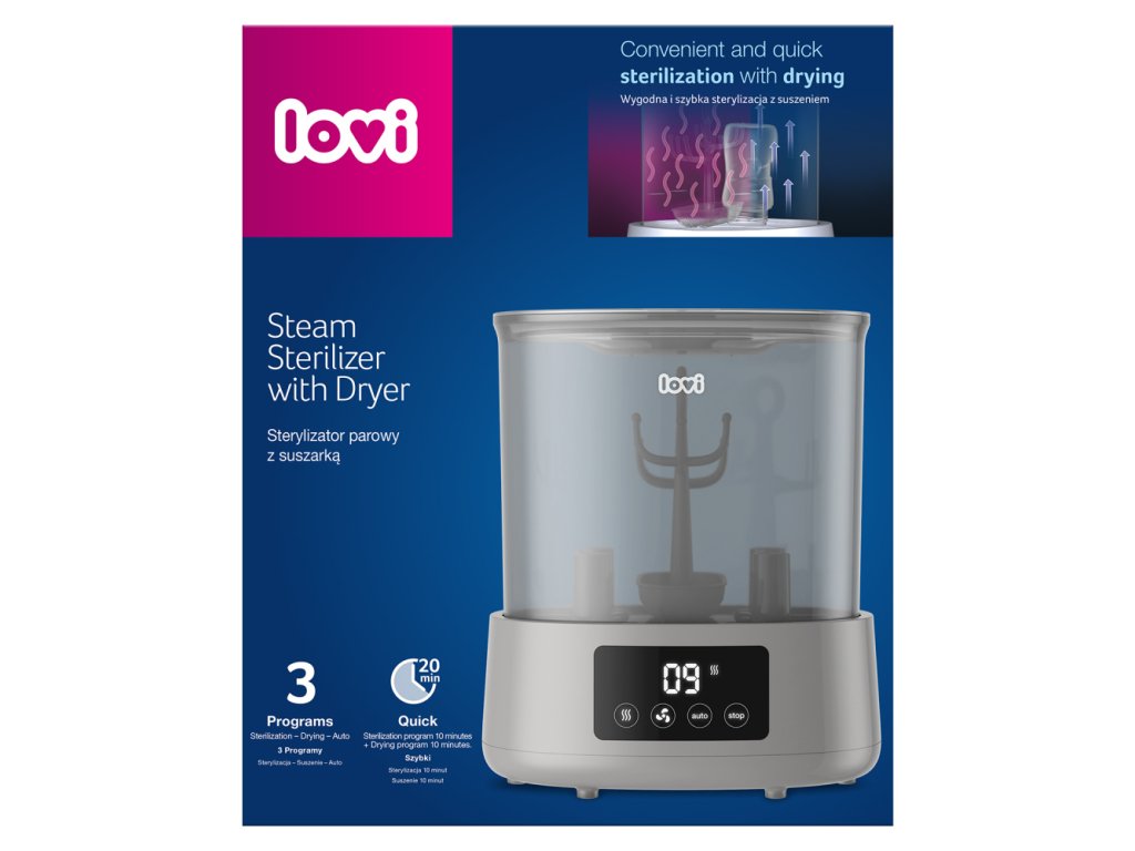 Hatékony és praktikus újdonság a LOVI márka portfóliójában - Sterilizáló szárítóval, amely rendkívül kényelmes és gyors. A sterilizáló és a szárító kombinációja egyedülálló megoldás a piacon, és nagy segítség az anyukáknak a mindennapi életben. A sterilizáló nemcsak sterilizál, hanem szárítja is a cumisüvegeket és egyéb tartozékokat. Akár 3 program egyetlen eszközben, aminek köszönhetően a cumisüvegeket és egyéb tartozékokat sterilizálja, szárítja és biztonságosan biztosítja, hogy 20 perc alatt újra használhatók legyenek.