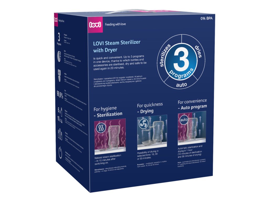 A LOVI 3 az 1-ben szárítós sterilizáló kényelmet és gyorsaságot jelent. Innovatív termék modern változatban, amely nemcsak sterilizál, hanem szárít is. Akár 3 program egyetlen eszközben, melynek köszönhetően a cumisüvegek és tartozékok sterilizálva, szárazon és biztonságosan újra használhatók 20 percen belül.