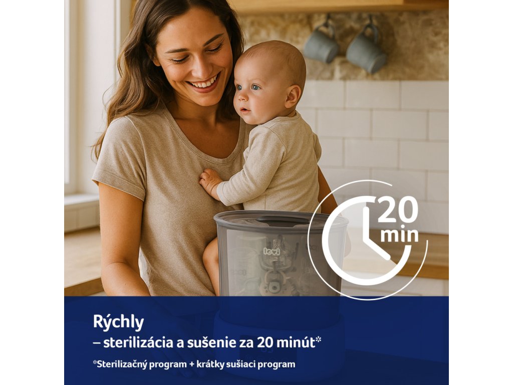 GYORSASÁG - Sterilizálás és szárítás akár 20 perc alatt is. Csak kapcsolja be a Sterilizálás programot, amely 10 percig tart, majd a legrövidebb Szárítás programot, amely szintén 10 percig tart.