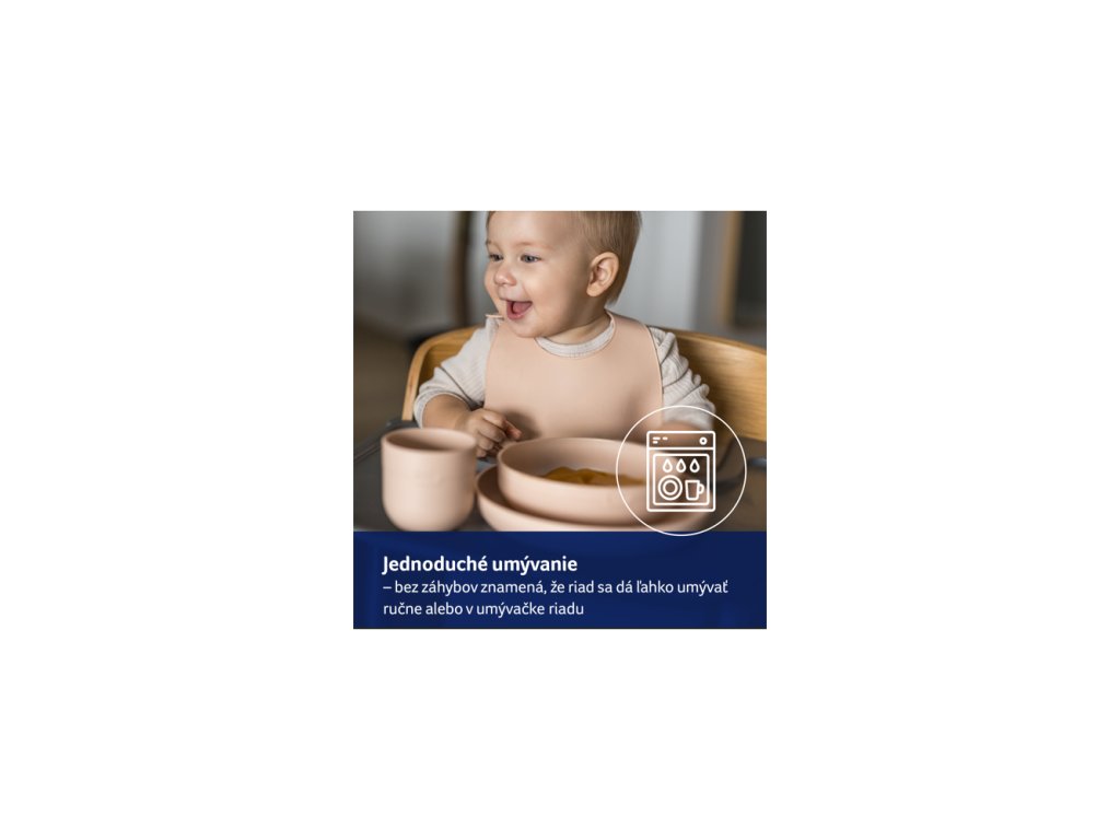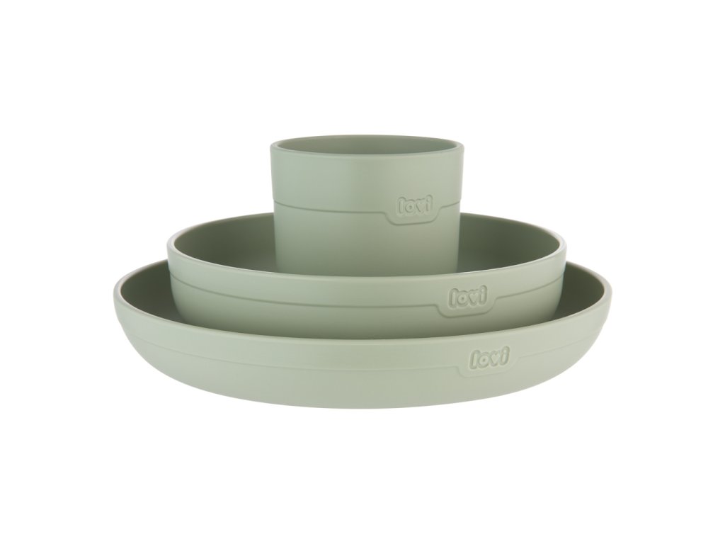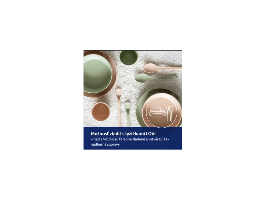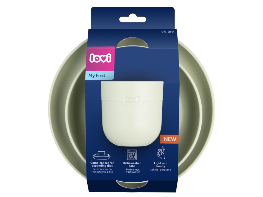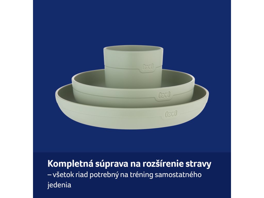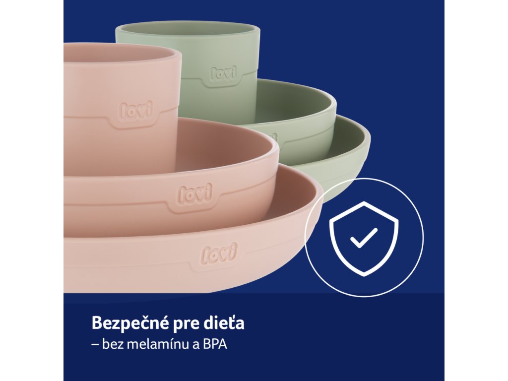 A LOVI étkészlet ideális termék a gyermek önálló étkezéséhez – tál, tányér és bögre. Könnyű és praktikus étkészlet melamin és BPA nélkül.