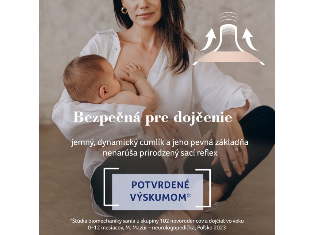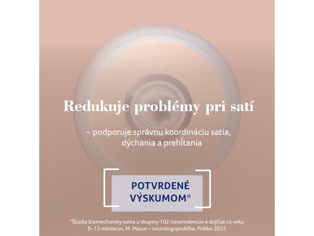 A széles, profilozott forma az anya mellének mintájára, és a tökéletes arányok biztosítják, hogy a gyermek szája megfelelő szögben helyezkedjen el, az ajkak szorosan záródjanak, és a gyermek szabadon lélegezhessen az orrán keresztül, ami csökkenti a kólikák kockázatát.