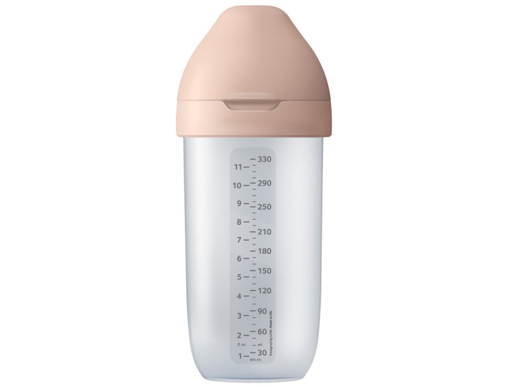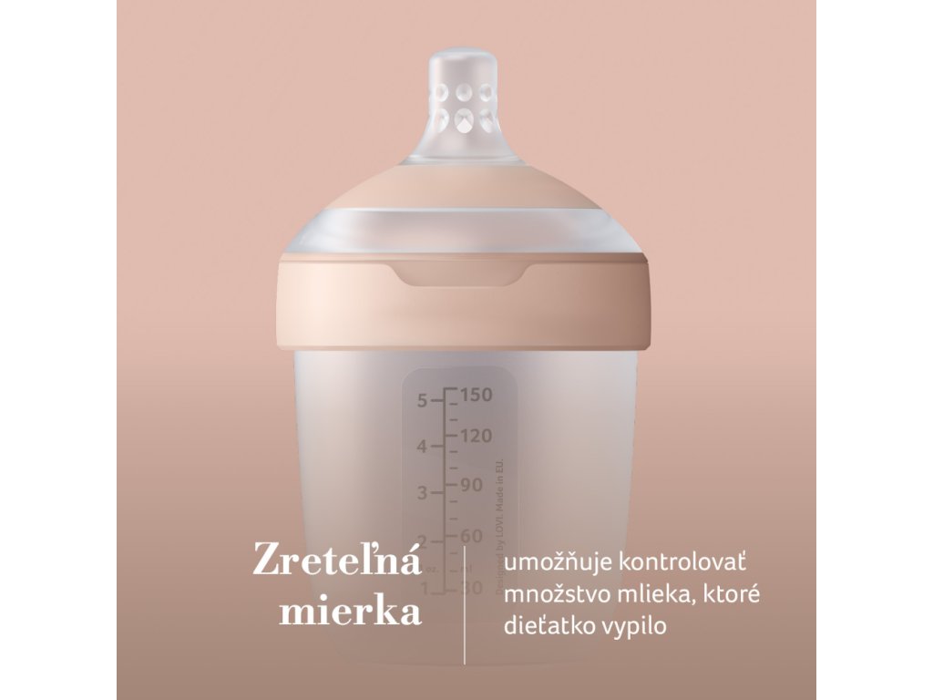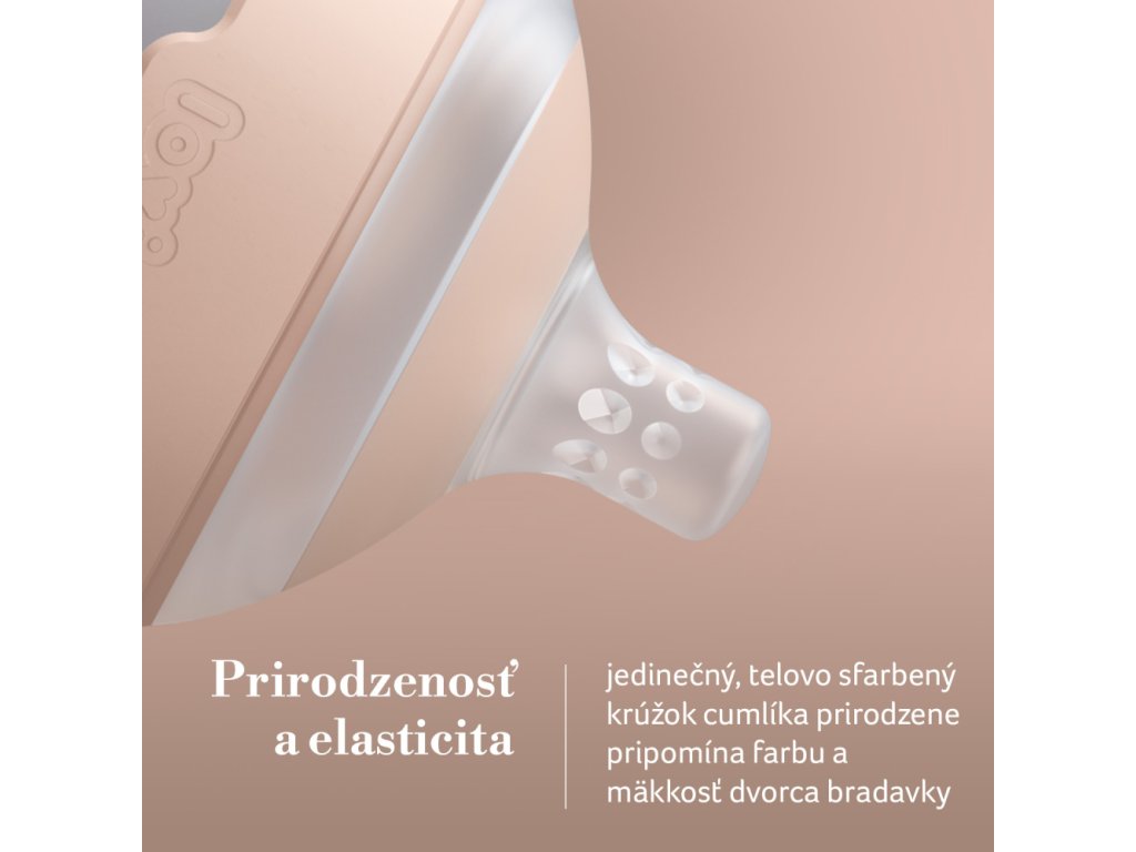 • Természetesség és rugalmasság, finom gyűrű a cumisüvegen a mellbimbó udvarának színében.