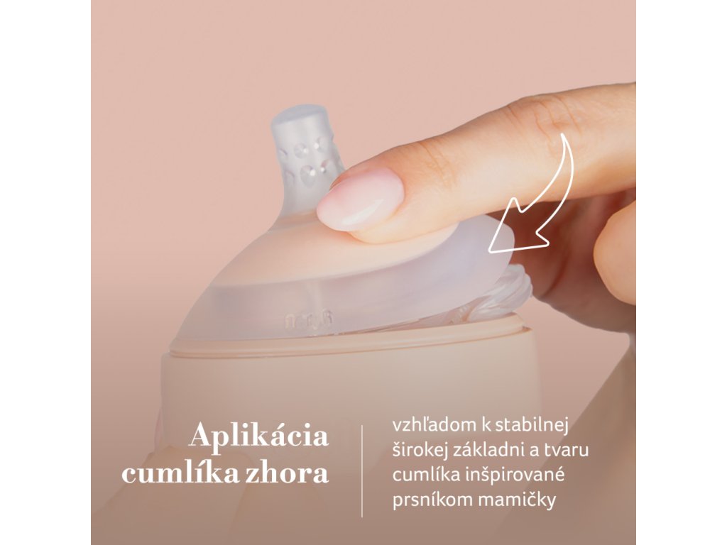 A széles, profilozott forma az anya mellének mintájára, és a tökéletes arányok biztosítják, hogy a gyermek szája megfelelő szögben helyezkedjen el, az ajkak szorosan záródjanak, és a gyermek szabadon lélegezhessen az orrán keresztül, ami csökkenti a kólikák kockázatát.