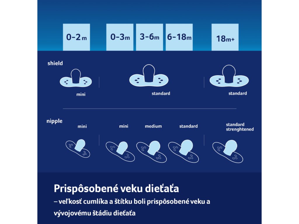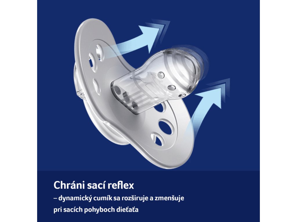 A szilikon hegy formája a természetes szopási reflexhez igazodik, a szilikon rész a pajzsnál keskeny, a végén pedig kiszélesedik, így a hegy a baba szopási ritmusának megfelelően nyúlik és húzódik össze. Ennek köszönhetően a babák szopási reflexe védett, és a cumi szopása nincs káros hatással a szoptatásra. A szívóka szimmetrikus formája az anya tejjel teli mellbimbójának formáján alapul, amely ismerős érzést nyújt a babának, hasonlóan a mellből való szopáshoz. A szívóka lapított, és a cumi vége olyan vékony, hogy lehetővé teszi a gyermek számára, hogy szabadon zárja a száját, és szopás közben megfelelően dolgozzon az ínyével, ugyanakkor elegendő helyet biztosít a szájban a nyelv munkájához, ami csökkenti a malocclusio és a beszédhibák kockázatát*.