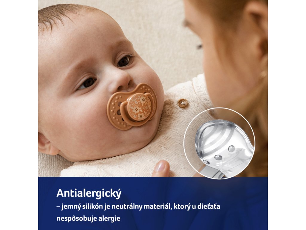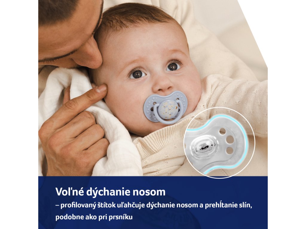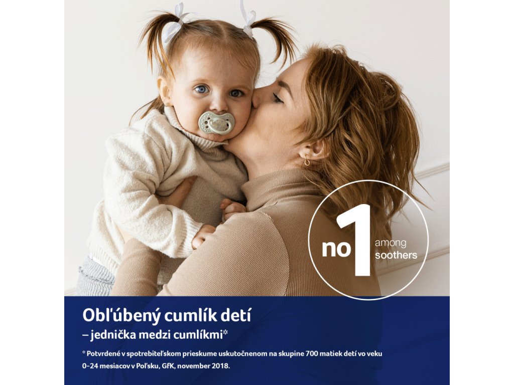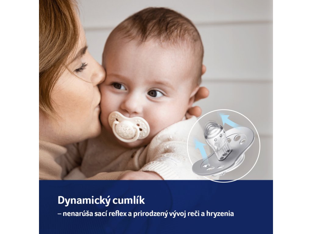 A szilikon hegy formája a természetes szopási reflexhez igazodik, a szilikon rész a pajzsnál keskeny, a végén pedig kiszélesedik, így a hegy a baba szopási ritmusának megfelelően nyúlik és húzódik össze. Ennek köszönhetően a babák szopási reflexe védett, és a cumi szopása nincs káros hatással a szoptatásra. A szívóka szimmetrikus formája az anya tejjel teli mellbimbójának formáján alapul, amely ismerős érzést nyújt a babának, hasonlóan a mellből való szopáshoz. A szívóka lapított, és a cumi vége olyan vékony, hogy lehetővé teszi a gyermek számára, hogy szabadon zárja a száját, és szopás közben megfelelően dolgozzon az ínyével, ugyanakkor elegendő helyet biztosít a szájban a nyelv munkájához, ami csökkenti a malocclusio és a beszédhibák kockázatát*.