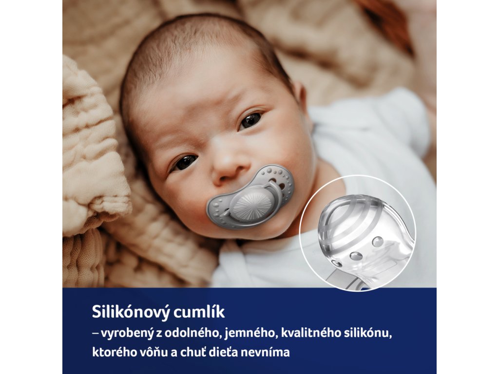 Formája lehetővé teszi a gyermek számára, hogy könnyen lélegezzen az orrán keresztül; biztonságos, biszfenol A-mentes anyagokat használnak.
