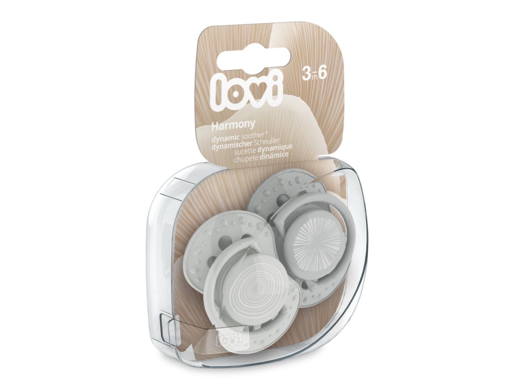 A LOVI® szilikon dinamikus cumit neurológusokkal együttműködve tervezték. Egyedi design: heterogén szilikon és szimmetrikus forma, melyet a mellbimbó ihletett. Nem zavarja a szopóreflexet, a természetes beszédfejlődést és a gyermek harapását. A cumi szokatlan kialakítása és színei kiemelik a Harmony kollekció egyediségét.