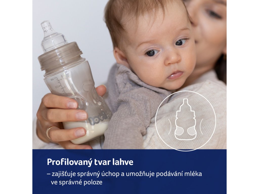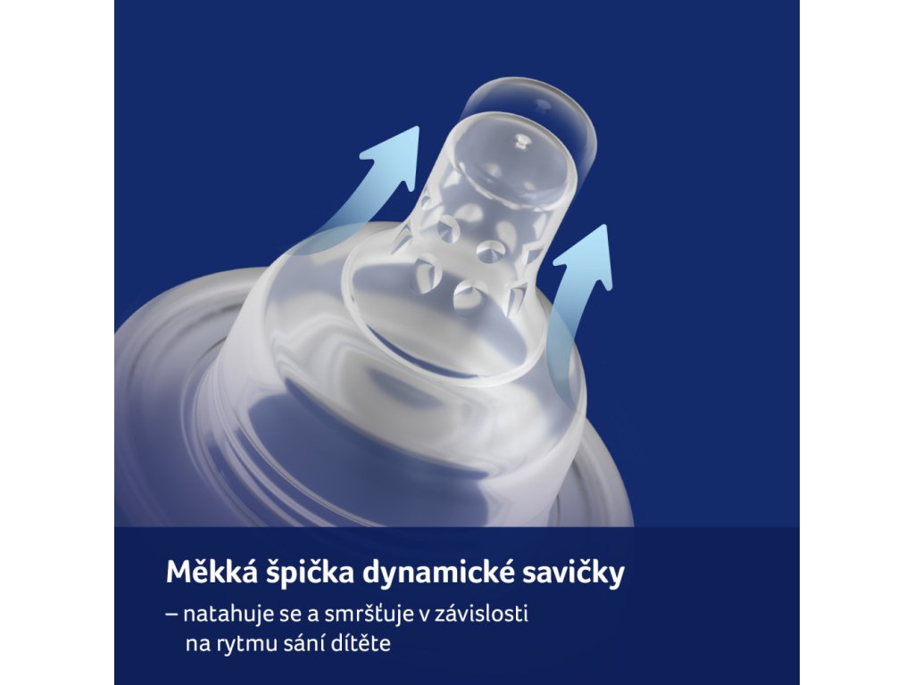 A cumisüveg dinamikus csúcsa vékony szilikonrétegből készül, és dinamikusan alkalmazkodik a baba szívásához (meghosszabbodik). Serkenti az állkapocs izmainak aktív működését. A tej nem folyik ki, a babának aktívan szívnia kell.