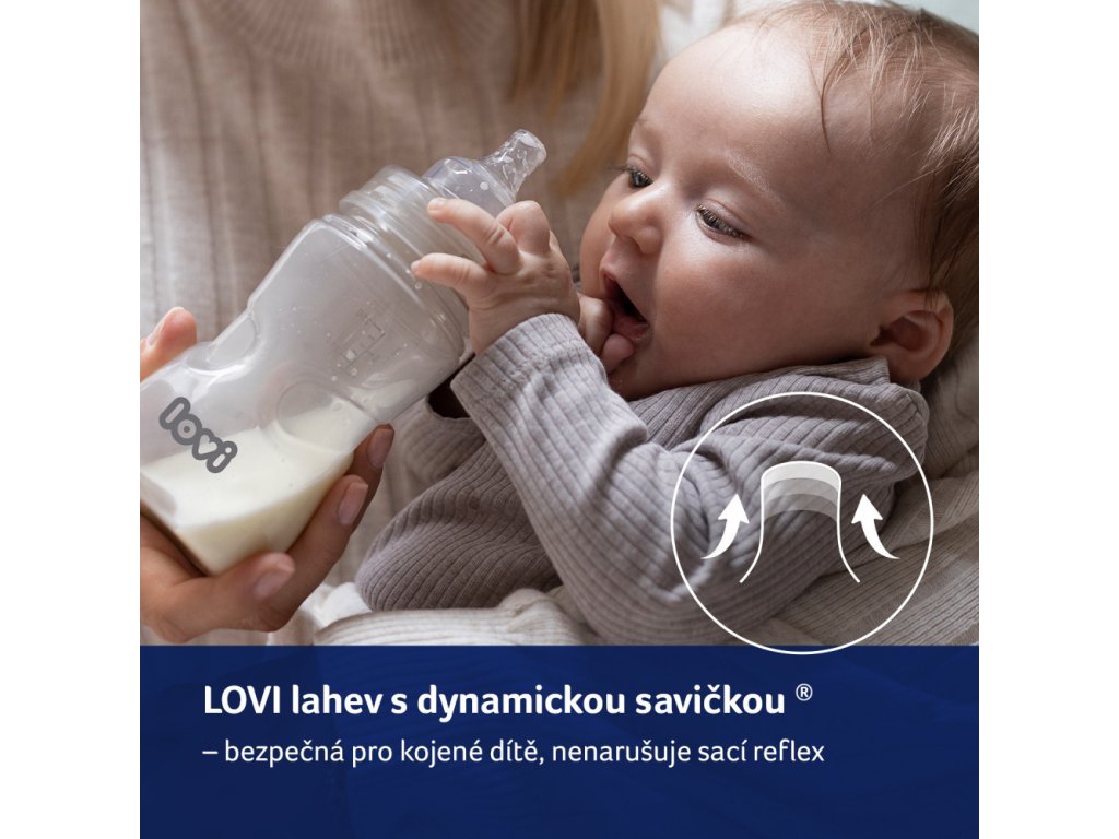 A LOVI cumisüveg biztonságos a szoptatott babák számára, mert nem zavarja a szopási reflexet. Klinikailag tesztelt. Dinamikus cumival® rendelkezik, amely vékony, hosszabbodó véggel, kemény, széles, formázott alappal rendelkezik.