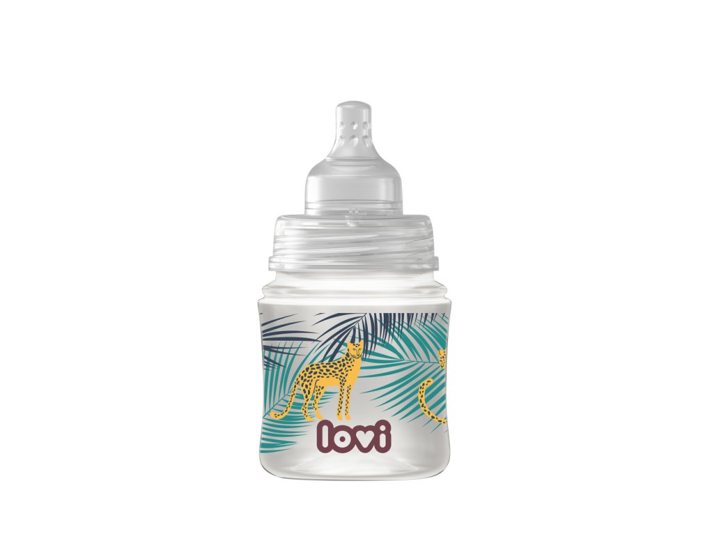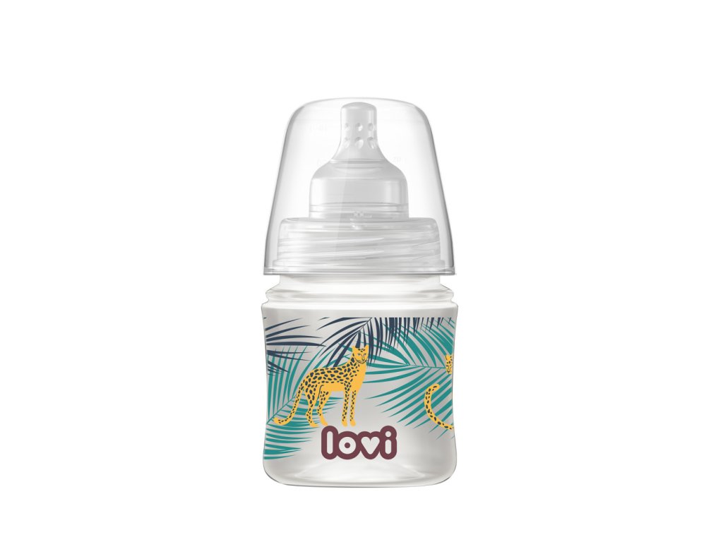 120 ml-es cumisüveg, biztonságos szoptatás közben, a JUNGLE VIBES kollekció dizájnjával.Lehetővé teszi a cumisüvegből való táplálás és a szoptatás kombinálását. A cumisüveg LOVI dinamikus etetőcumival van felszerelve, amely táplálás közben módosítja az alakját. Nem zavarja a szívóreflexet. A cumi hatékony SUPER Vent légtelenítő rendszerrel van ellátva, amely megakadályozza a vákuum kialakulását.