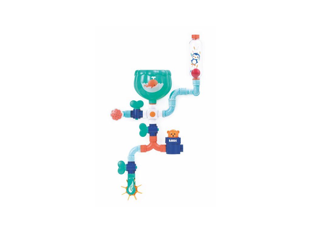 A csomag tartalma: tartály tapadókorongokkal, csatlakozó, 3 vízcsap, 6 cső, dupla cső, átlátszó tartály labdával, vízimalom, zuhanyfej, mackó, merőkanál