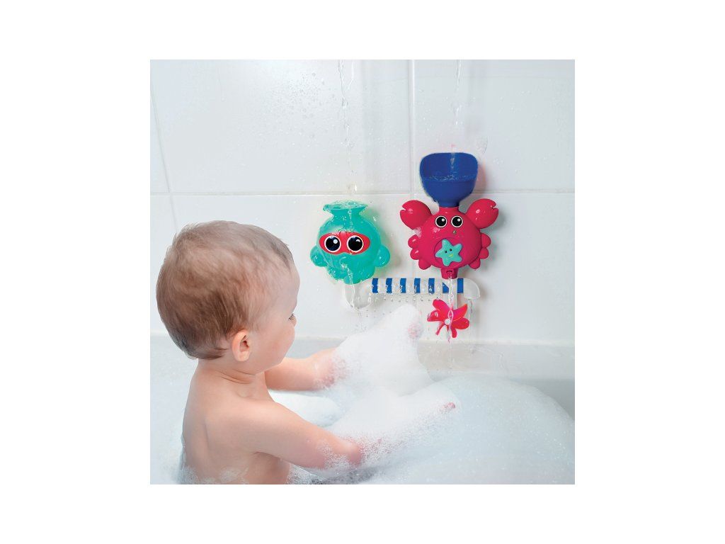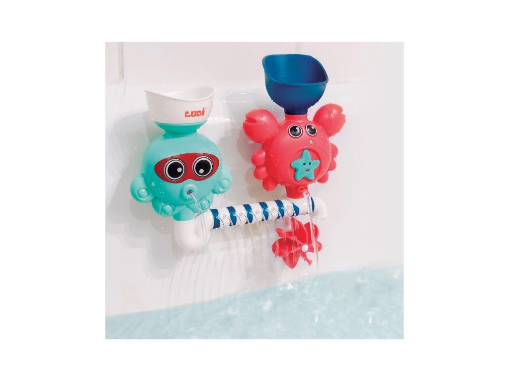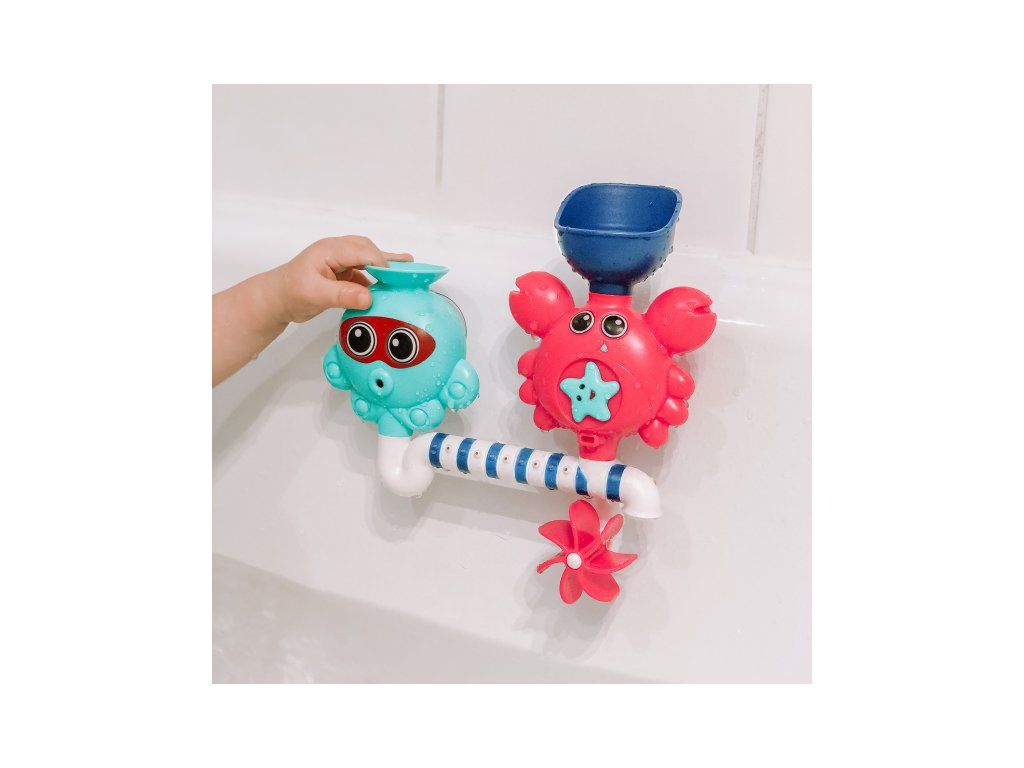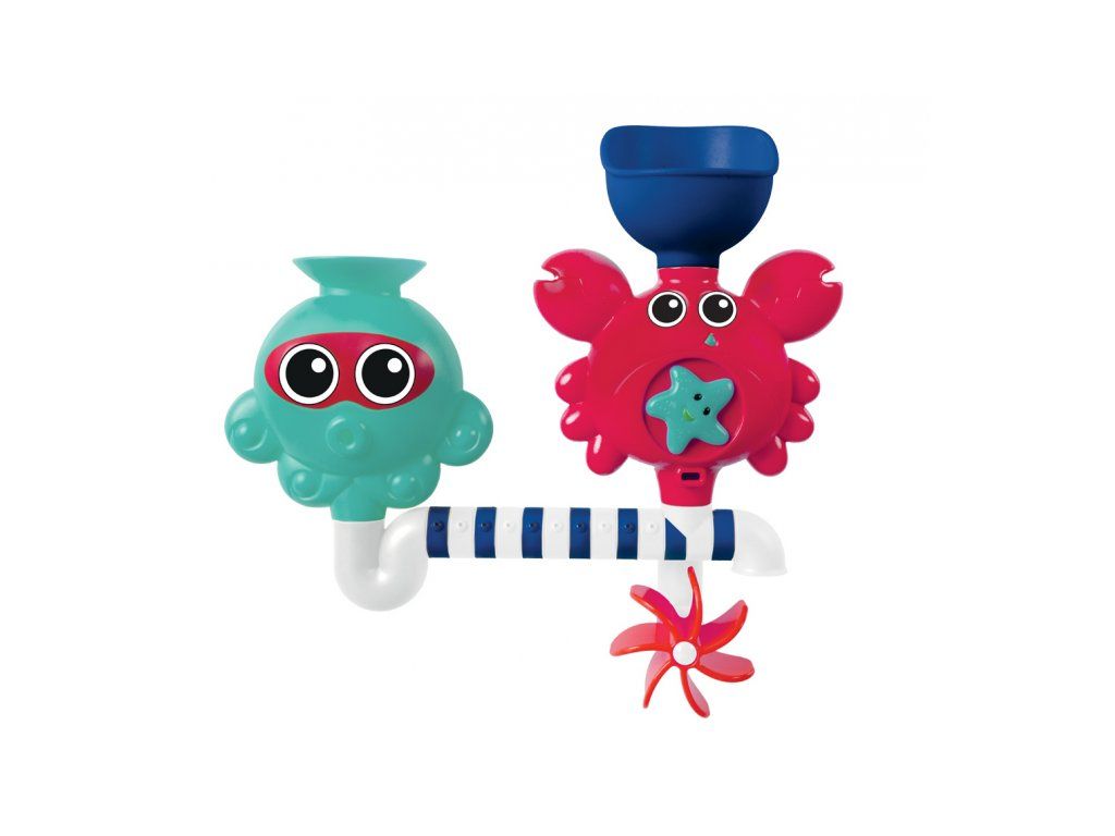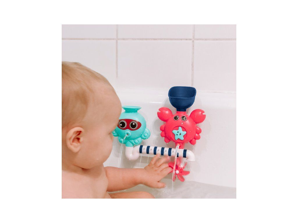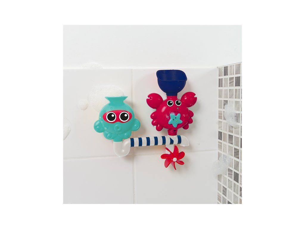 A vidám és szórakoztató fürdőjáték a gyermekedet és téged is szórakoztatni fog! Figyeljétek együtt, mi történik, amikor vizet öntötök a tölcsérekbe, és az a csövek különböző nyílásain keresztül spriccelni kezd, miközben megpörgeti a vízimalmot! A gyermek a vízzel való játék során megtanulja megérteni az okot és az okozatot, fejleszti megfigyelőképességét és ügyességét.