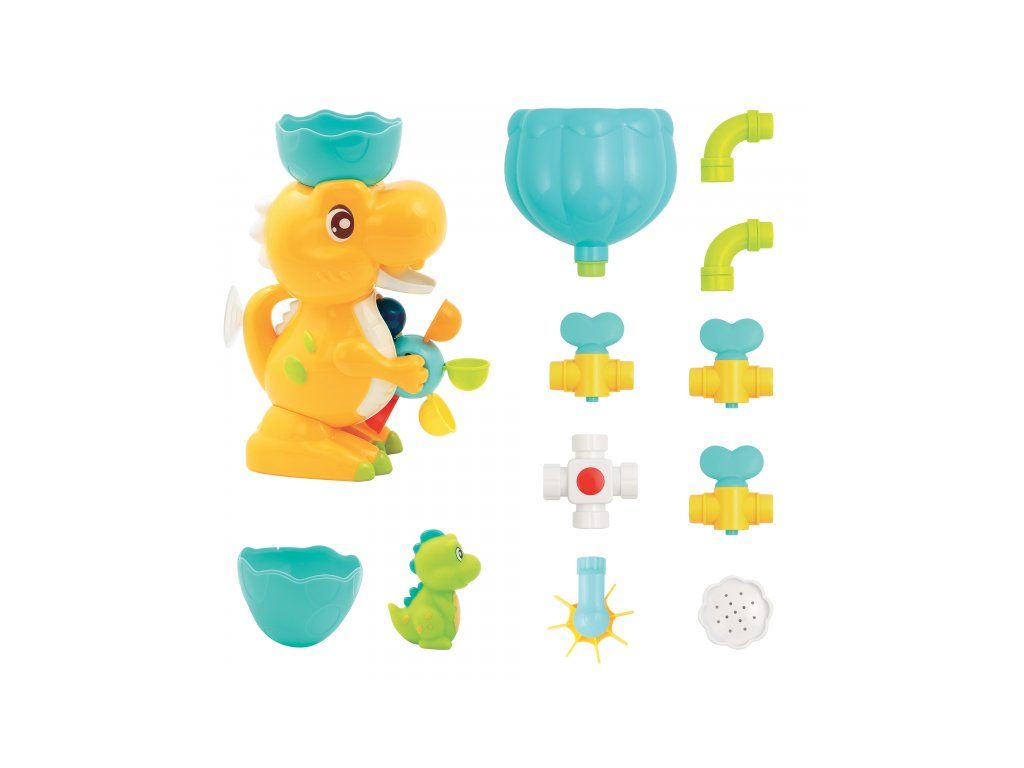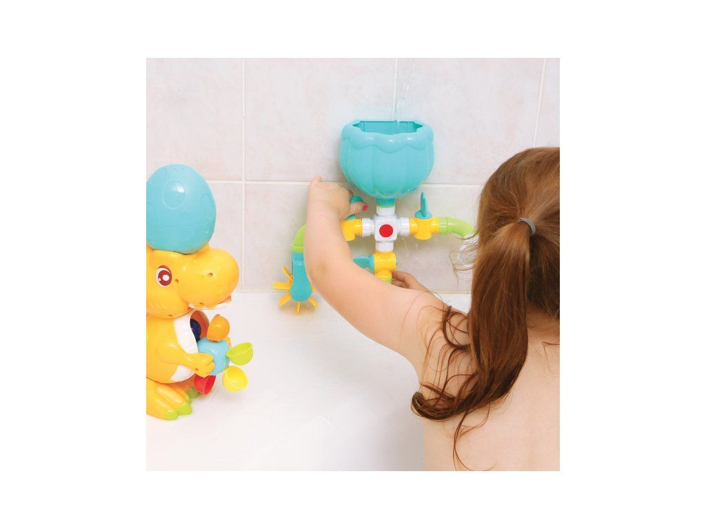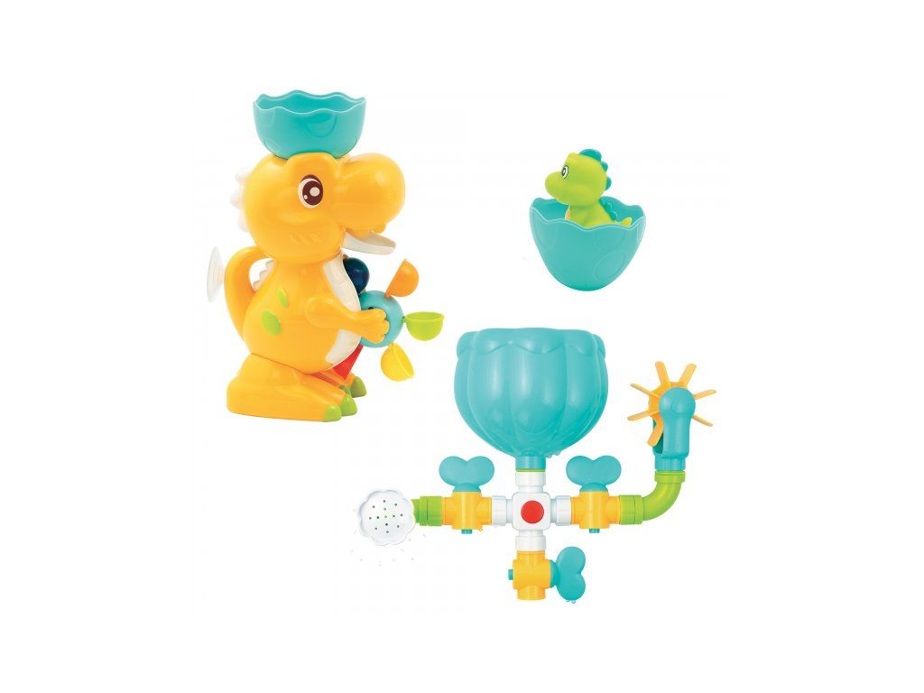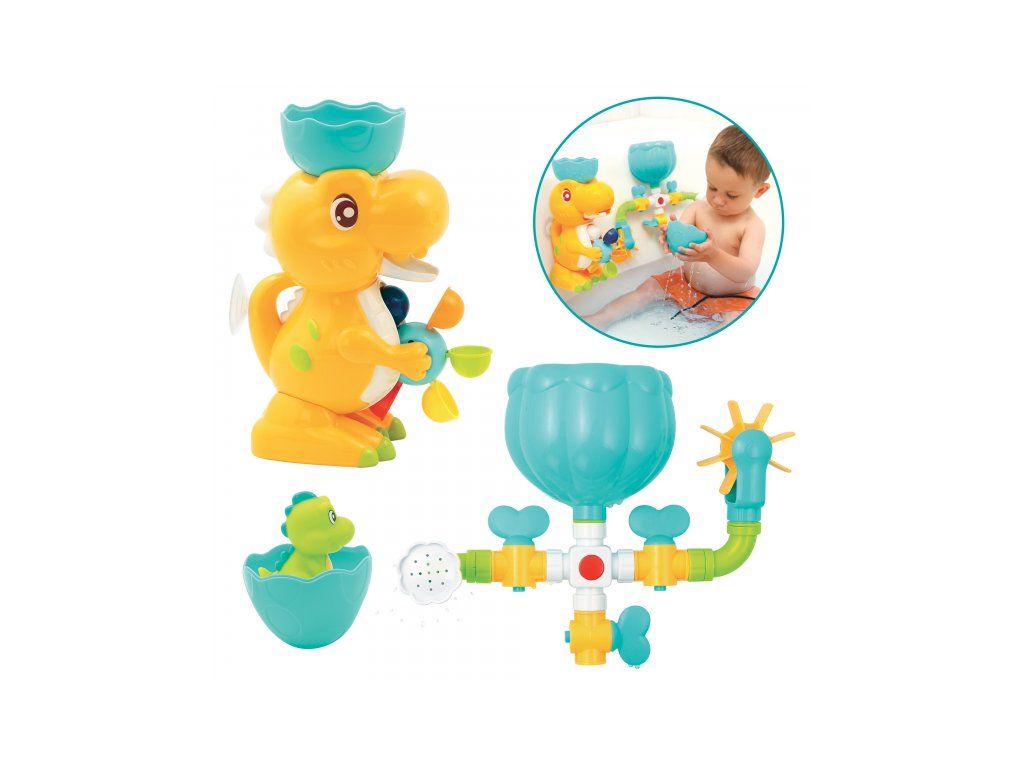A változatos fürdőjáték a kedves dinoszaurusz családdal garantálja, hogy a fürdés a kádban nem lesz unalmas sem a gyermeked, sem számodra! A csaptelepekkel, tartállyal, zuhannyal és vízimalommal ellátott vízkör különböző összeállítási lehetőségeket kínál a víz hatásainak felfedezéséhez. A nagy dinoszaurusz tojáshéj formájú tölcsérrel forgatja a vízimalmot, a dinoszaurusz kölyök el tud rejtőzni a tojásban, és megnyomás után vizet spriccel.