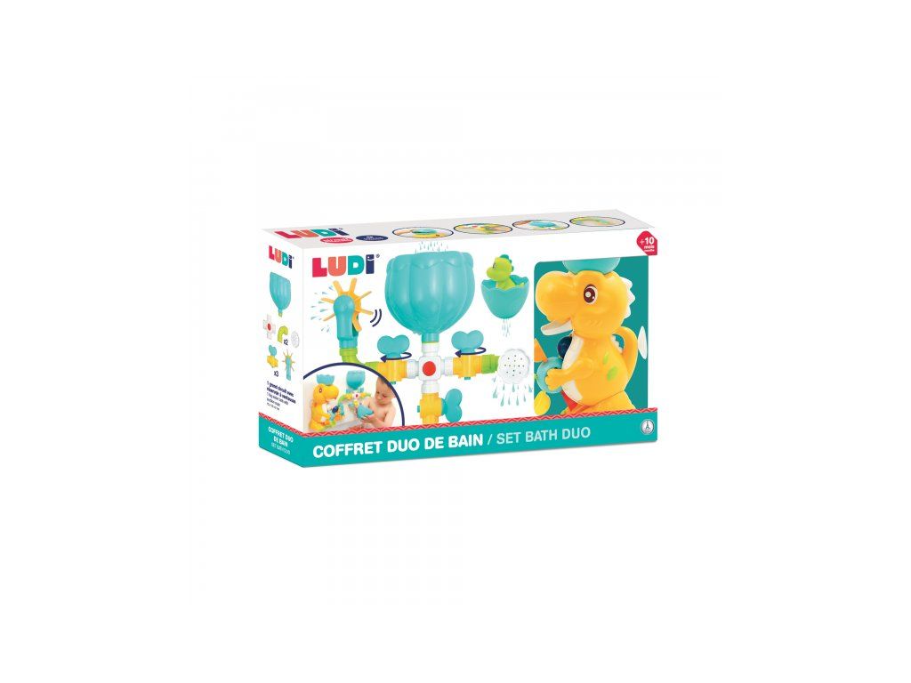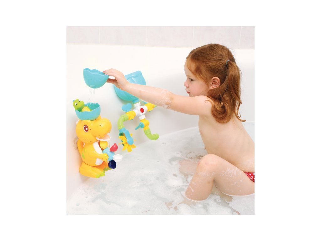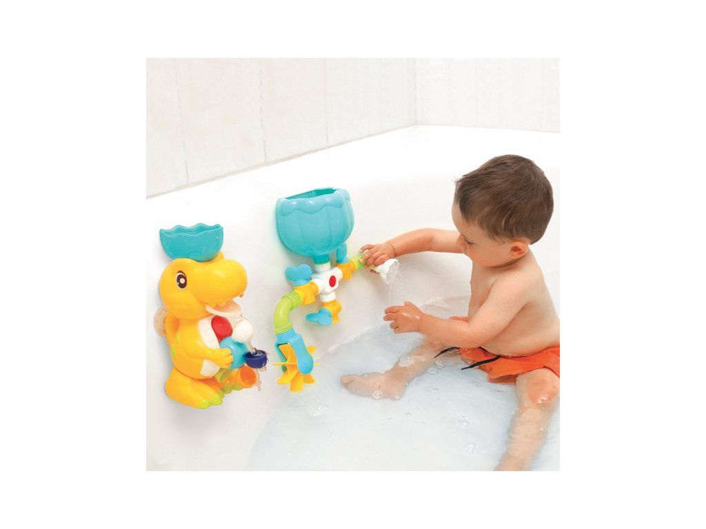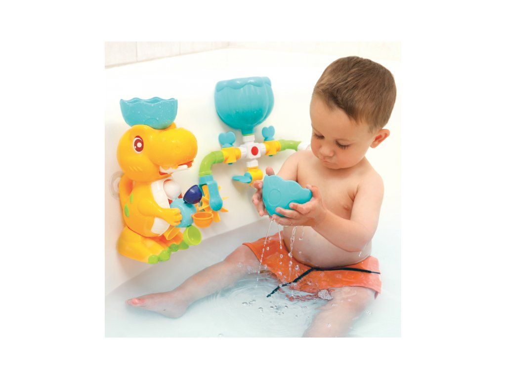 A változatos fürdőjáték a kedves dinoszaurusz családdal garantálja, hogy a fürdés a kádban nem lesz unalmas sem a gyermeked, sem számodra! A csaptelepekkel, tartállyal, zuhannyal és vízimalommal ellátott vízkör különböző összeállítási lehetőségeket kínál a víz hatásainak felfedezéséhez. A nagy dinoszaurusz tojáshéj formájú tölcsérrel forgatja a vízimalmot, a dinoszaurusz kölyök el tud rejtőzni a tojásban, és megnyomás után vizet spriccel.