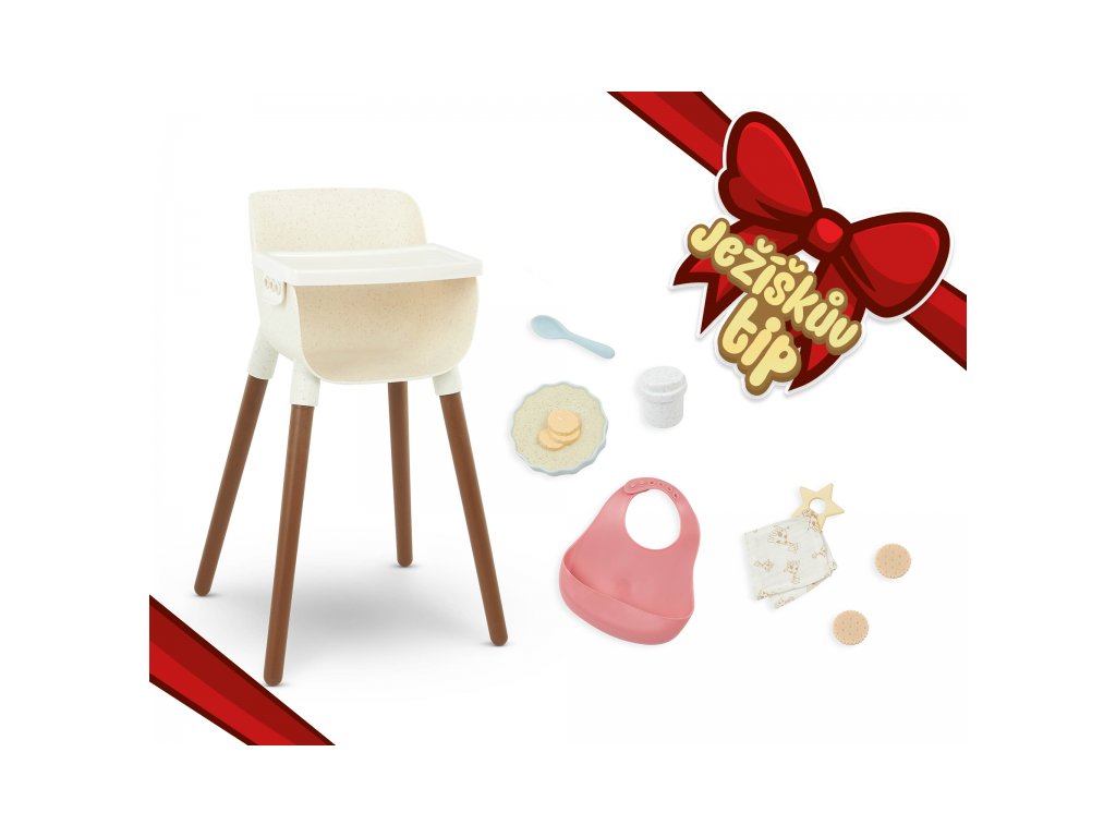 A stílusos, étkezőpulttal ellátott szék lehetővé teszi gyermekeinek, hogy kényelmesen leültessék babájukat, és megetessék őket a gazdag kiegészítő készlet segítségével, amely tartalmaz egy levehető fedelű bögrét, 2 kekszet, egy kanalat, egy banános zabkása tálat, egy előkét és egy rágókát.