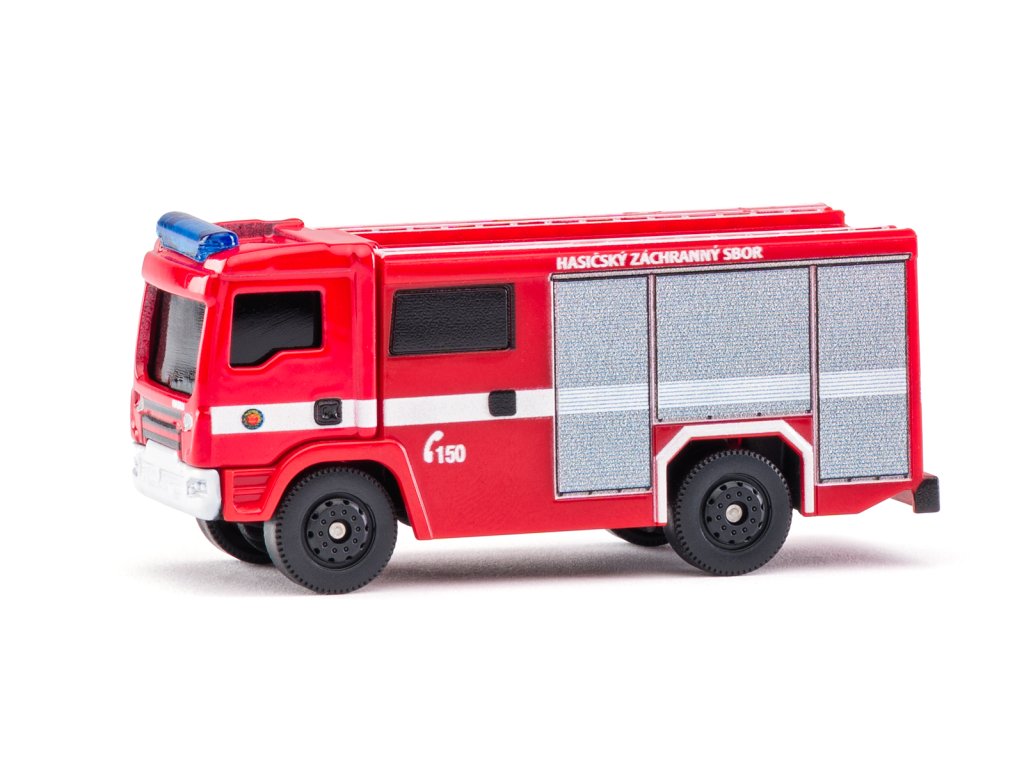 Cseh dizájnú tűzoltóautó modell. A tűzoltóautó működő fényekkel és hangokkal rendelkezik. Fém modell műanyag alkatrészekkel, 3 hüvelykes méretben. 3xAG3 elemmel működik, amelyeket a csomag tartalmaz. Bliszterben csomagolva. Csomag mérete: 11,5x14x5 cm. 3 éves kortól