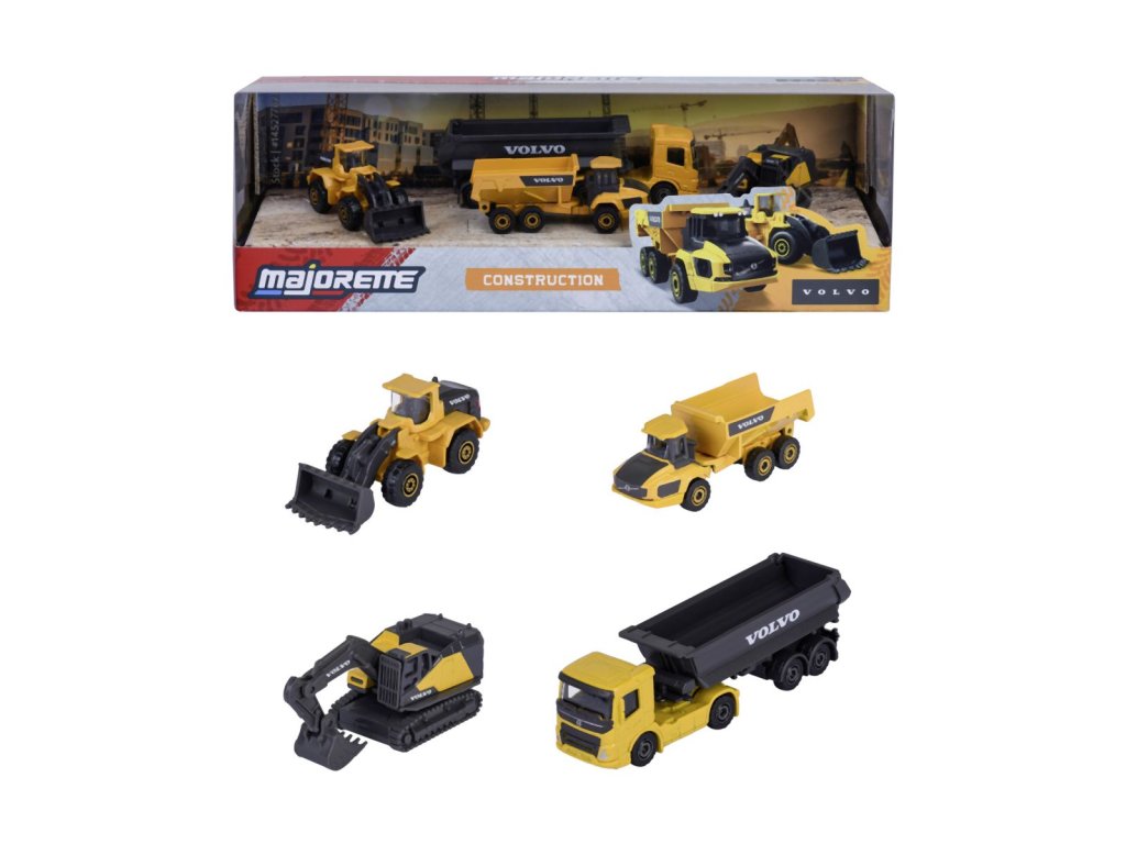 Volvo Kiadás ajándékkészlet 4 fém autóból és építőipari gépekből szabadonfutó kivitelben (lánctalpas kotró, homlokrakodó, billenőplatós teherautó, pótkocsis traktor), nyitható részekkel. Az autó hossza 7,5 cm.