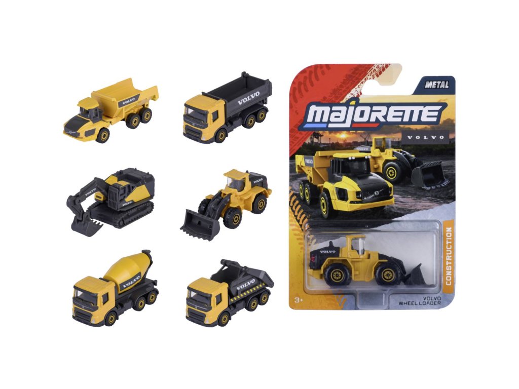 Volvo fém munkagépek és építőipari járművek, szabadonfutó, mozgatható alkatrészekkel, 6 féle (lánctalpas kotró, kerekes rakodó, dömper, platós vontató, betonkeverő és billenőplatós). Az autó hossza 7,5 cm.