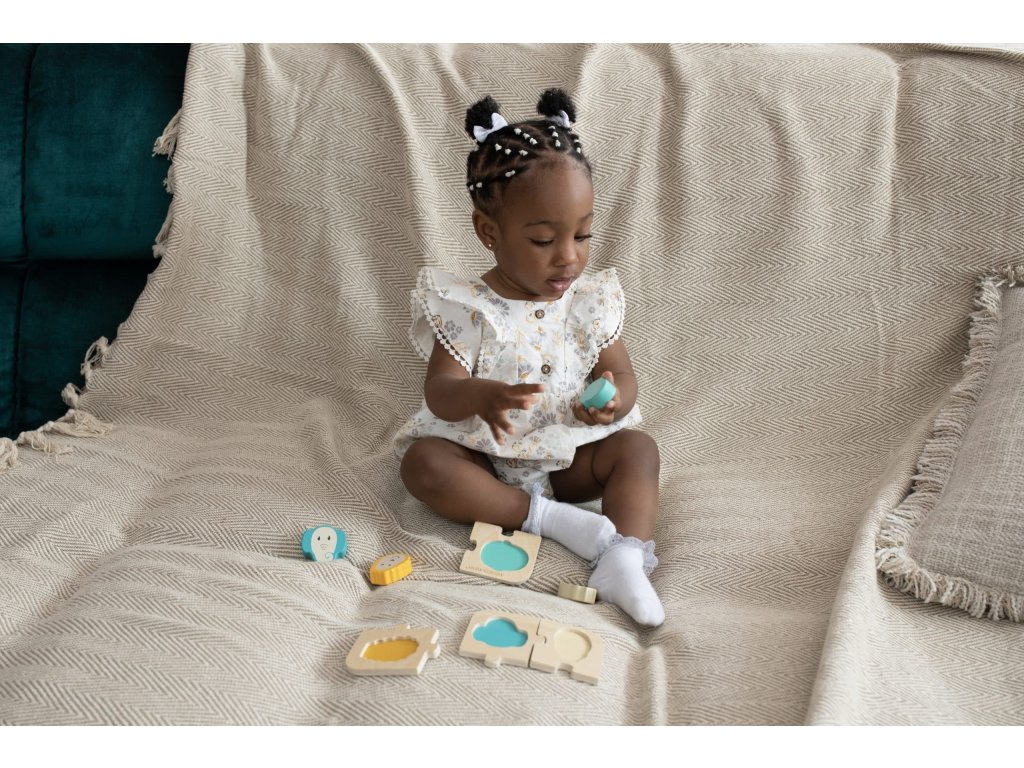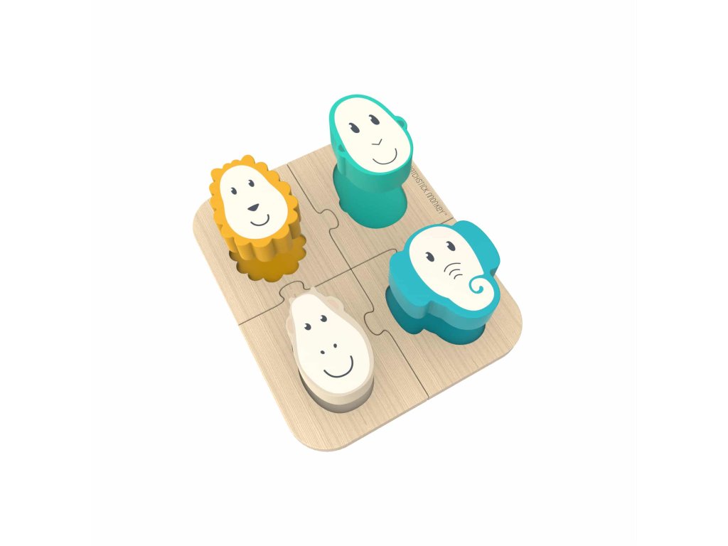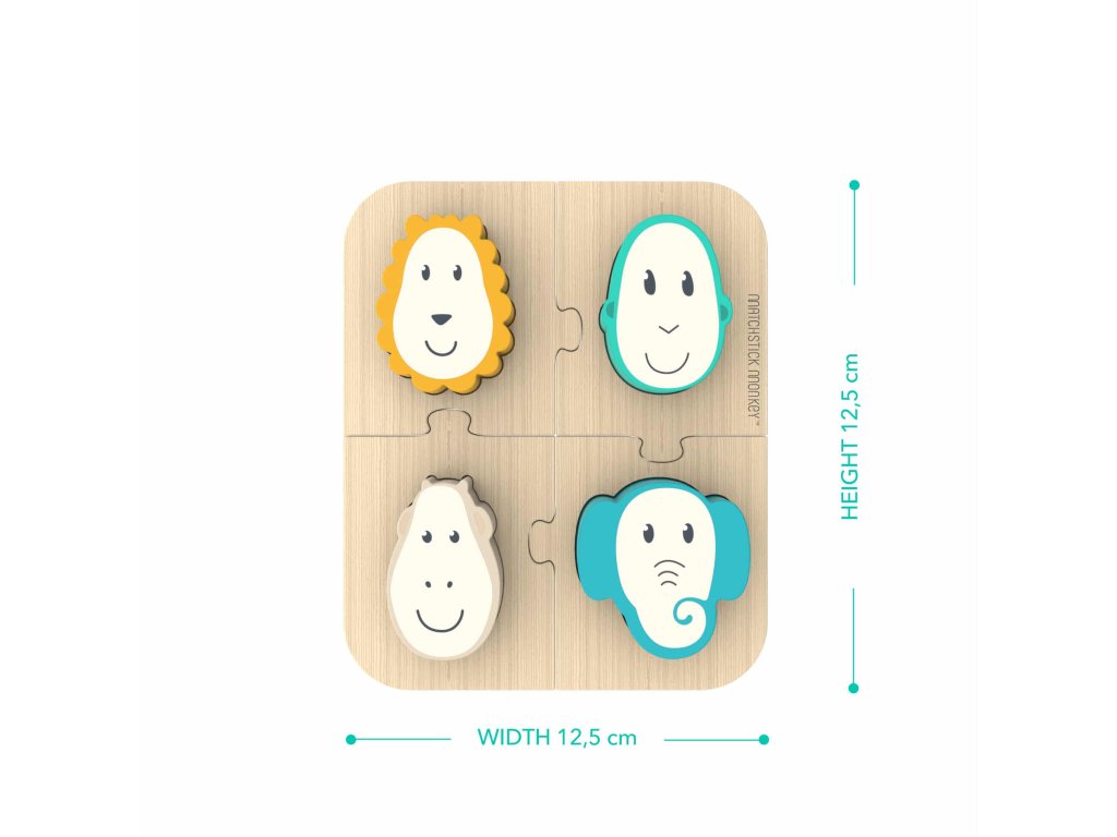A fából készült állatos kirakós és párosító játék tökéletes módja a korai fejlődés játékos támogatásának. A játék első része abból áll, hogy 4 puzzle-darabot helyezünk az alapba, hogy teljes formát hozzunk létre. Ezután párosíthatja az állatait a színes résekkel. Ez segíti a szem-kéz koordináció, a logikus gondolkodás fejlesztését, és elősegíti az állatok, színek és formák felismerését.