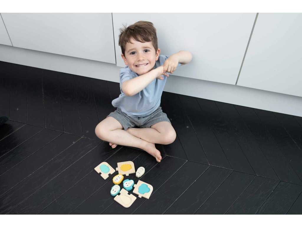 A játéknak szilárd fa részei vannak, amelyeket a kis kezek figyelembevételével terveztek, így könnyen megfoghatók és felemelhetők. Rétegelt lemezből készült, nem mérgező, vízbázisú festékekkel. Tökéletes ajándék kisgyermekeknek.