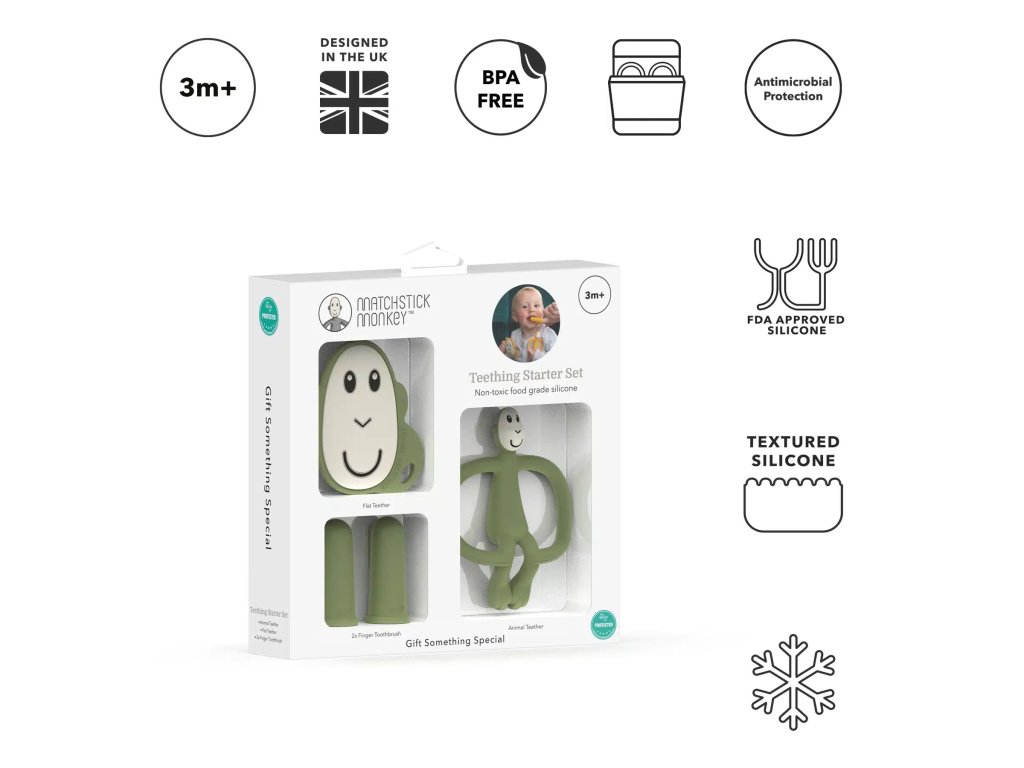Az olívazöld majom alakú rágóka szórakoztató, rugalmas , és texturált kidudorodásainak köszönhetően gyorsan eltalálja a fájó pontot. A lapos majombarátok kicsik, könnyűek és tökéletesek kisgyermekek kezébe – nagyszerűek utazáshoz vagy táskában. A szilikon ujjkefék ideálisak első fogkefék egy babának – gyengédek és kíméletesek az ínyhez.