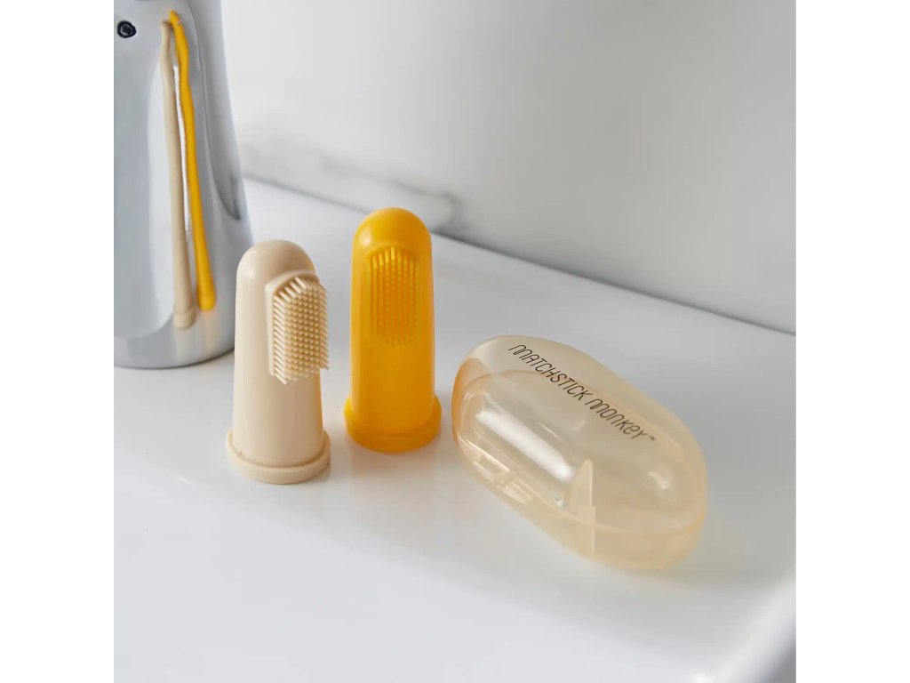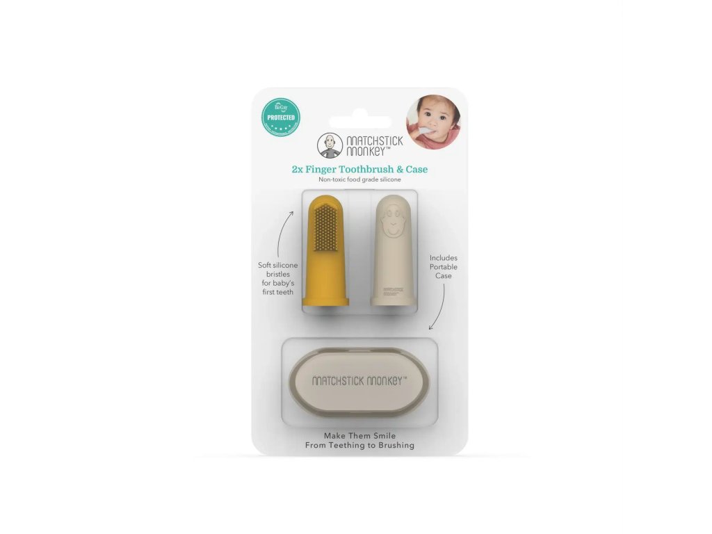 MATCHSTICK MONKEY ujjlenyomatú fogkefe finoman masszírozza és tisztítja a baba ínyét az első fogtól kezdve, tokjával pedig ideális utazáshoz is.