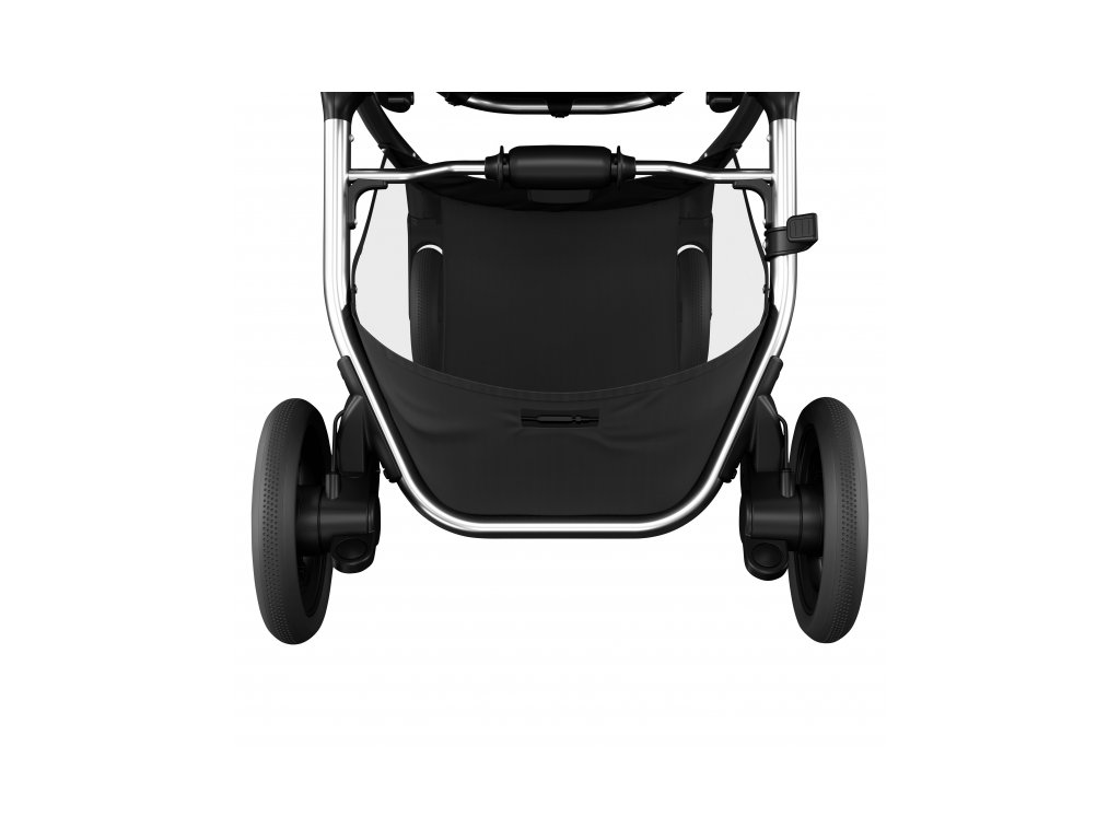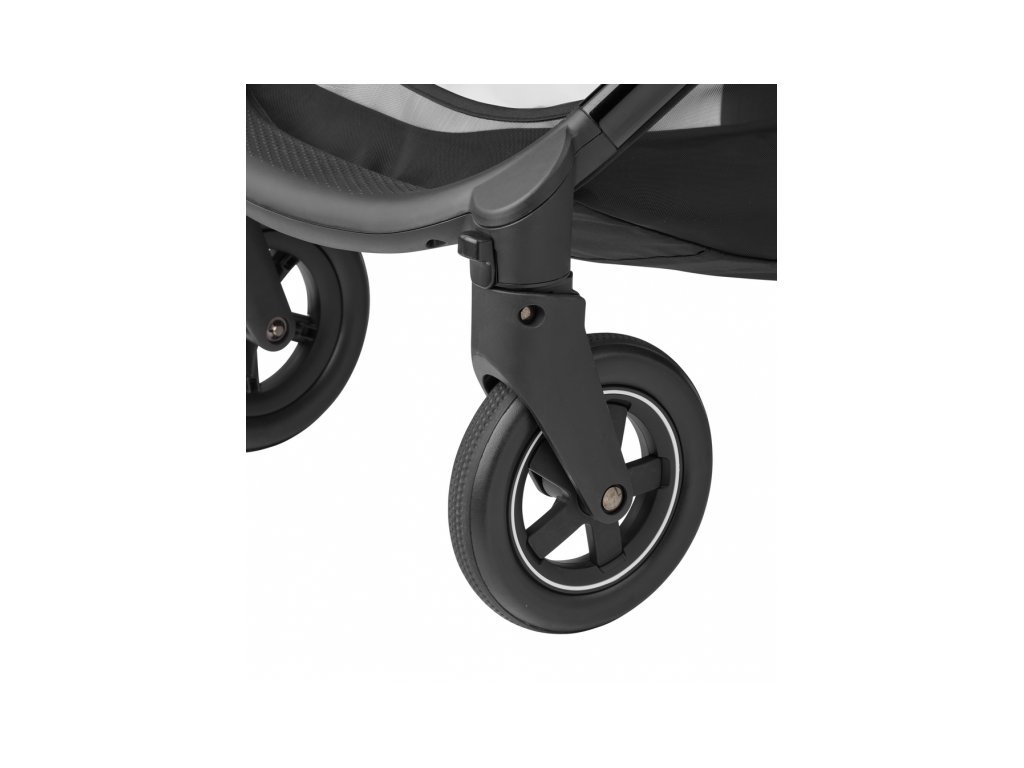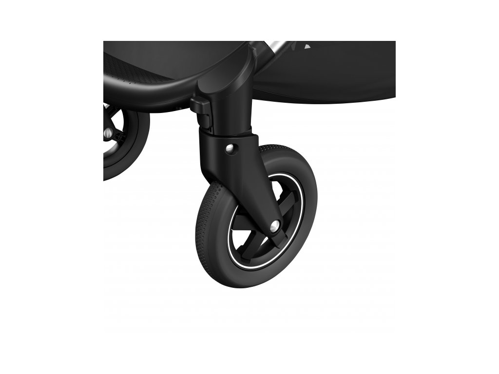 - A babakocsi első kerekei 360°-ban elforgathatók, és könnyen rögzíthetők a zökkenőmentes haladás érdekében
