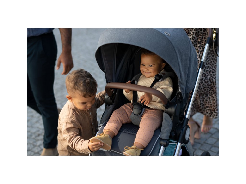 - A babakocsi fogantyúja és a gyermek előtti karfa műbőrrel van bevonva