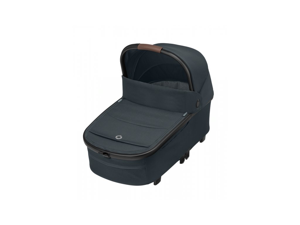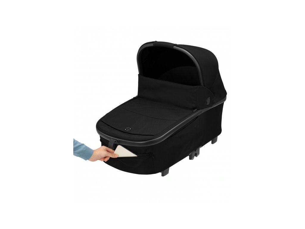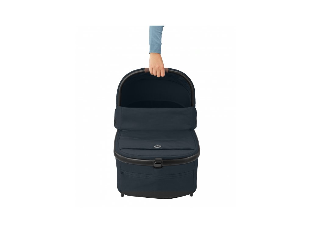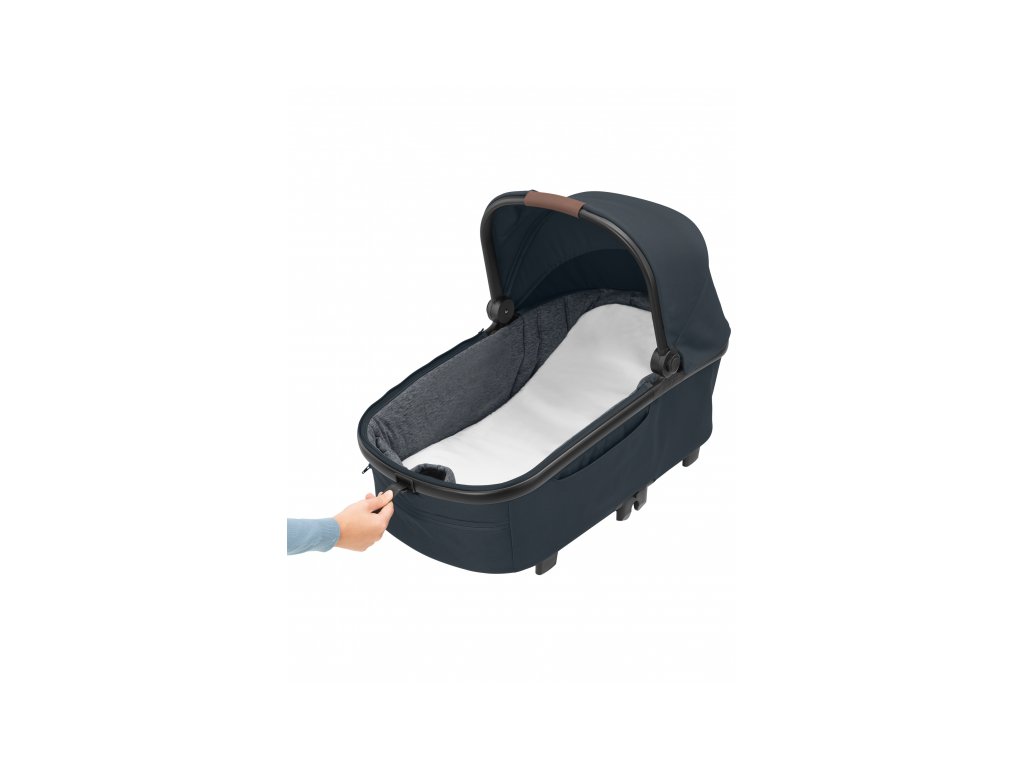 A babakocsi része egy kényelmes, tágas mózeskosár újszülött kortól a Maxi-Cosi Oria XXL.