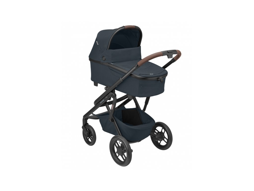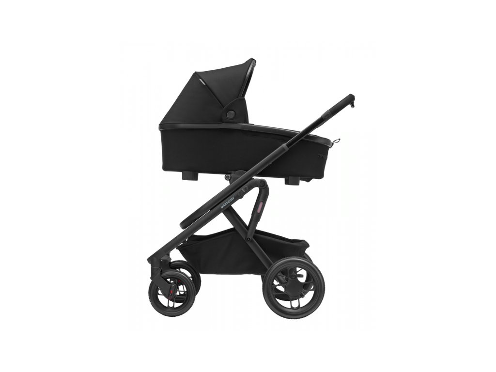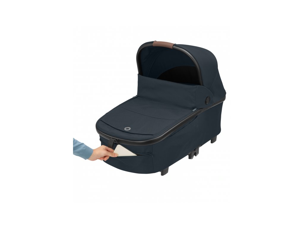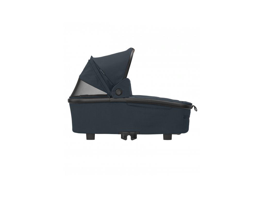 A babakocsi része egy kényelmes, tágas mózeskosár újszülött kortól a Maxi-Cosi Oria XXL.
