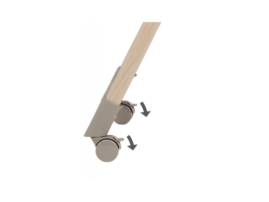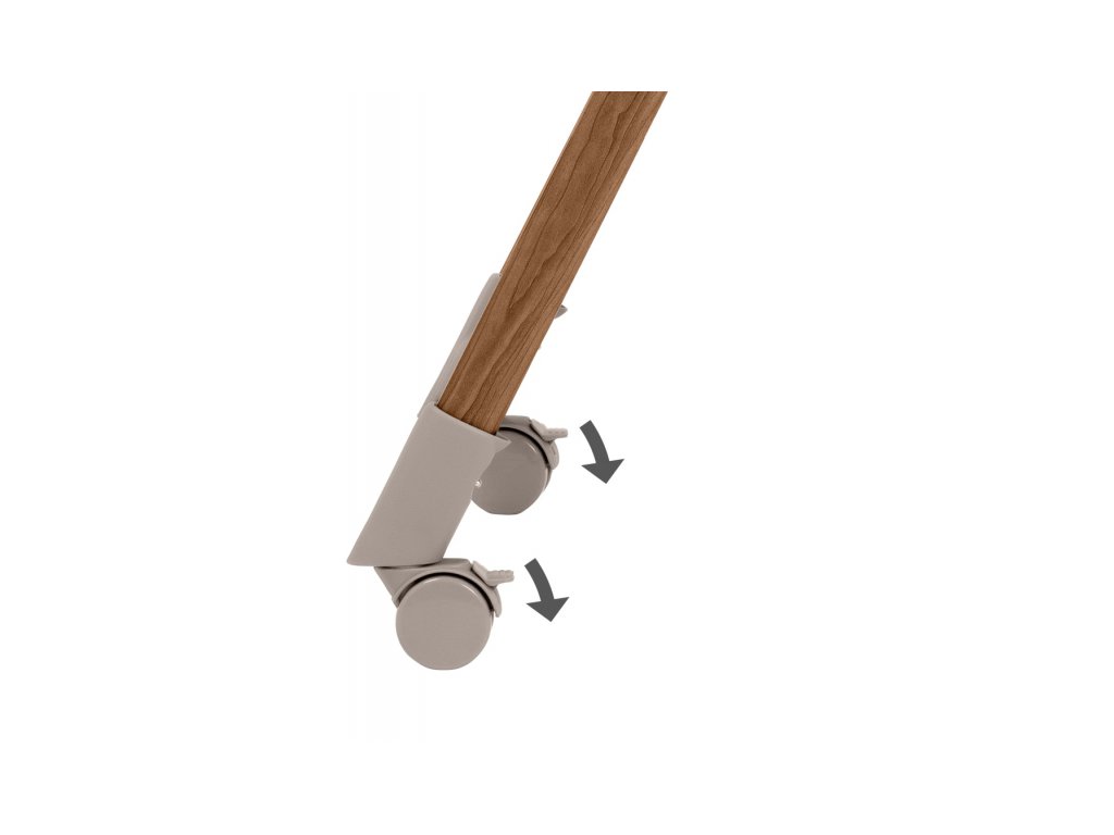 A négy kerék, az első lábakon forgatható, rögzítési lehetőséggel megkönnyíti a szék kezelését. Ha nem használja a széket, kompakt, lapos formára összehajtható a tároláshoz.