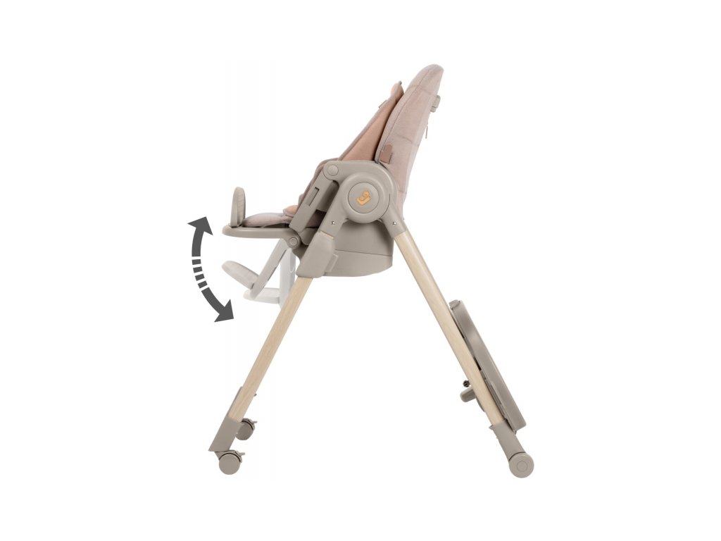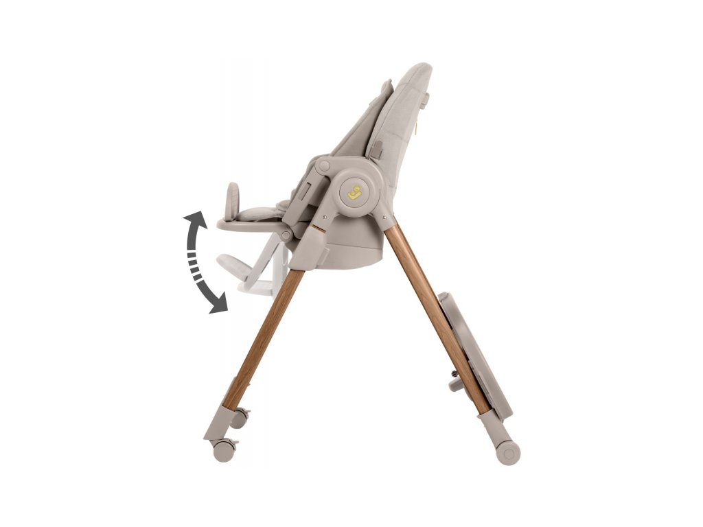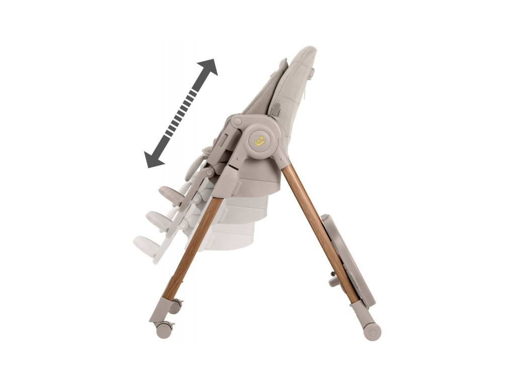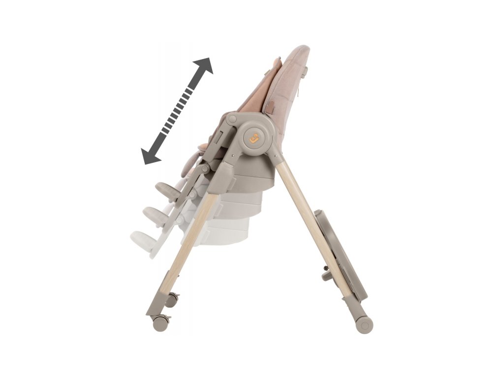 Az etetőszék 9 magasságbeállítást kínál, így szinte minden asztalhoz alkalmas. A hátsó támla 5 különböző pozícióba állítható, a fekvőtől az ülő helyzetig. A beállítási variabilitást 4 lábtartó variáció és 2 lábtartó pozíció egészíti ki.