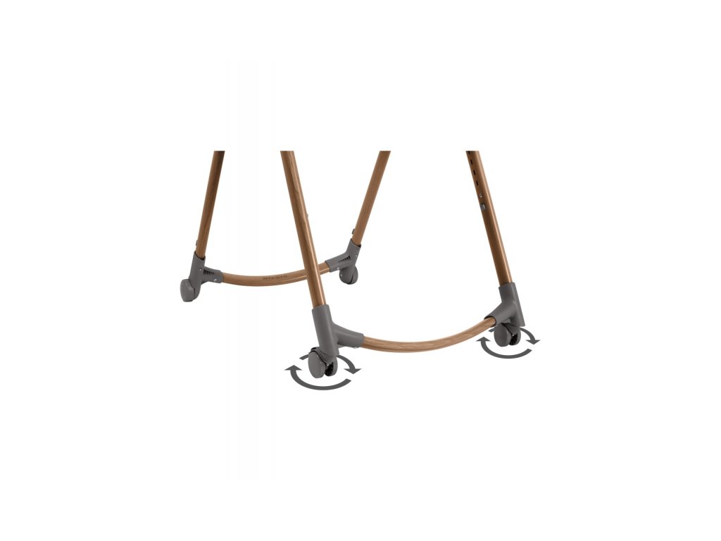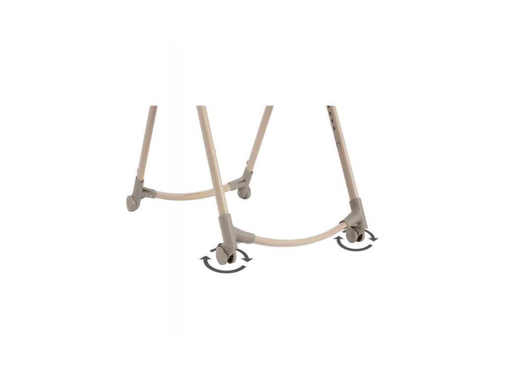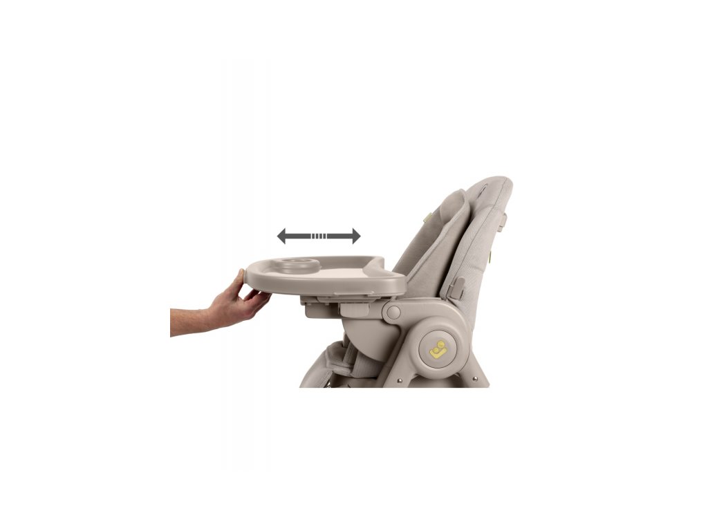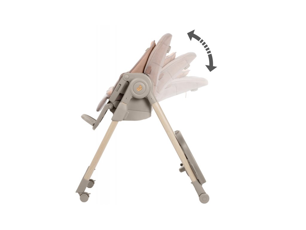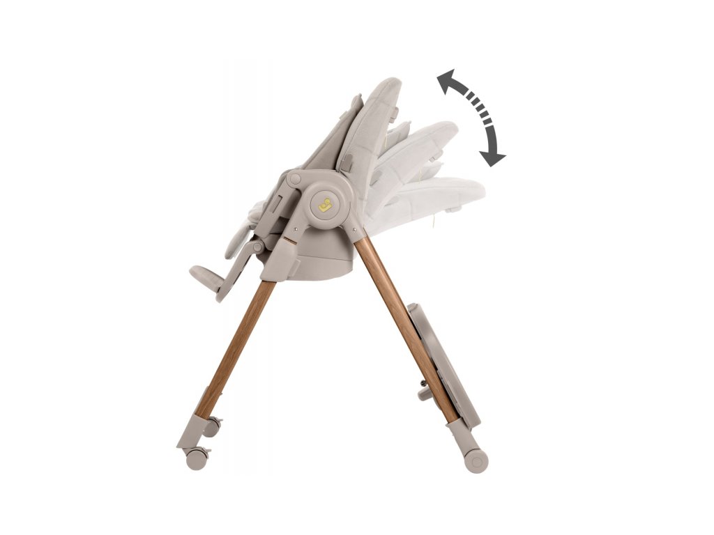 Az etetőszék 9 magasságbeállítást kínál, így szinte minden asztalhoz alkalmas. A hátsó támla 5 különböző pozícióba állítható, a fekvőtől az ülő helyzetig. A beállítási variabilitást 4 lábtartó variáció és 2 lábtartó pozíció egészíti ki.