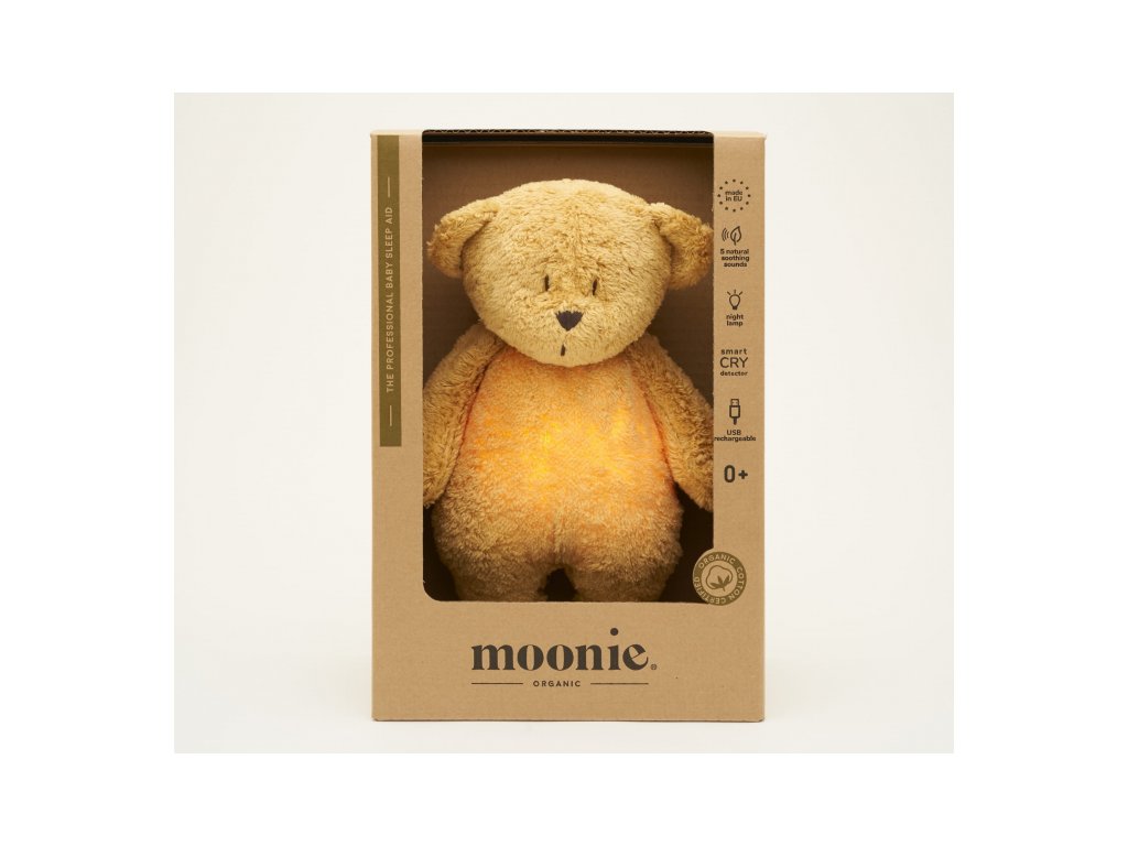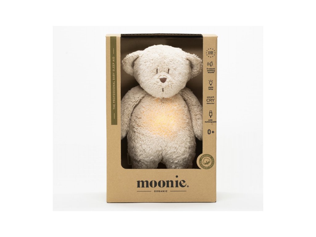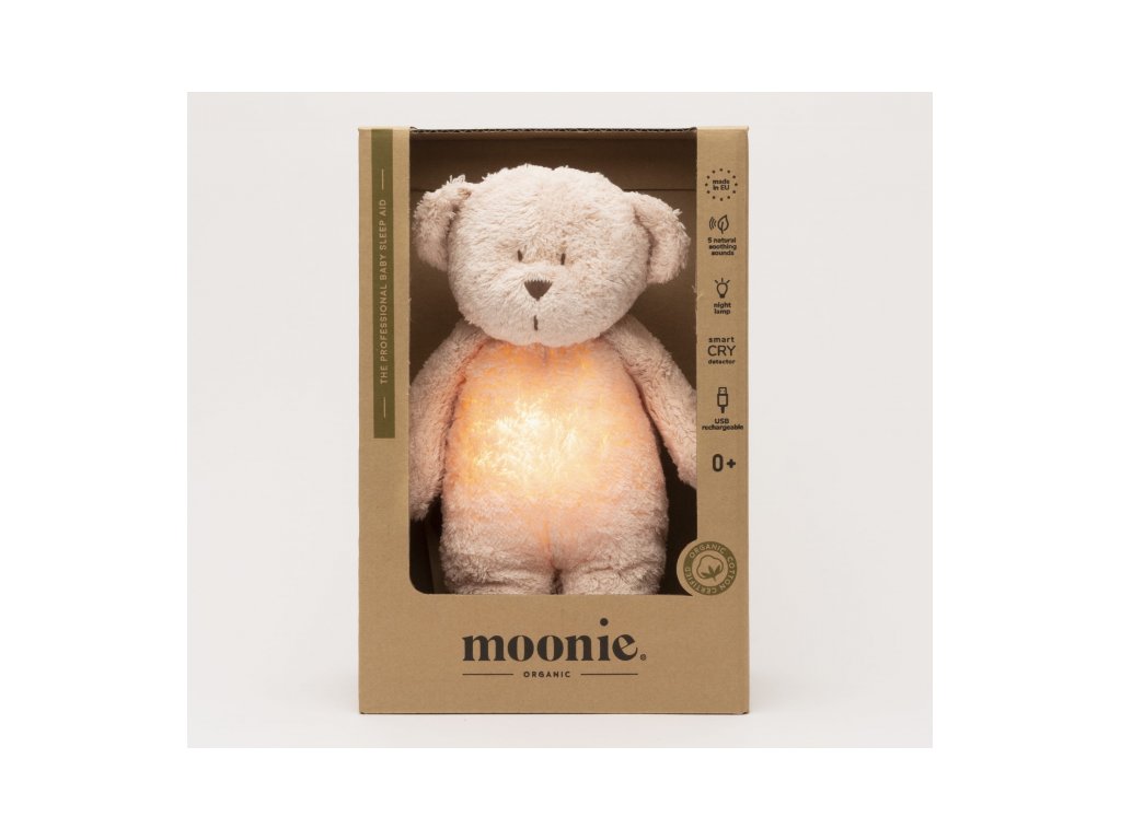 A Moonie altató aranyos maci formájában éjszakai fénnyel és relaxáló hangokkal segít a babának megnyugodni és könnyebben elaludni. A nyugtató hangok emlékeztetik a gyermeket az anyaméhben lévő környezetre a születése előtt. Az altató öt természetes, pihentető hangot kínál (szívverés, szél, erdei patak, tenger hullámai, eső), kalimba altatót, két klasszikus altatót, és lehetővé teszi a saját hangjának felvételét.