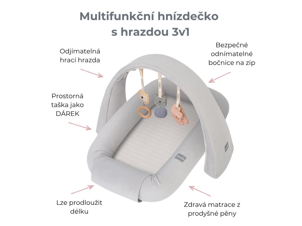 A 3 az 1-ben innovatív megoldás egyesíti a biztonságot, a kényelmet és a nyugodt alvást egyetlen készletben. A fészek együtt nő a babával és alkalmazkodik a napi rutinhoz - az alvástól a játékig, a pihenés nyugodt pillanataiig.