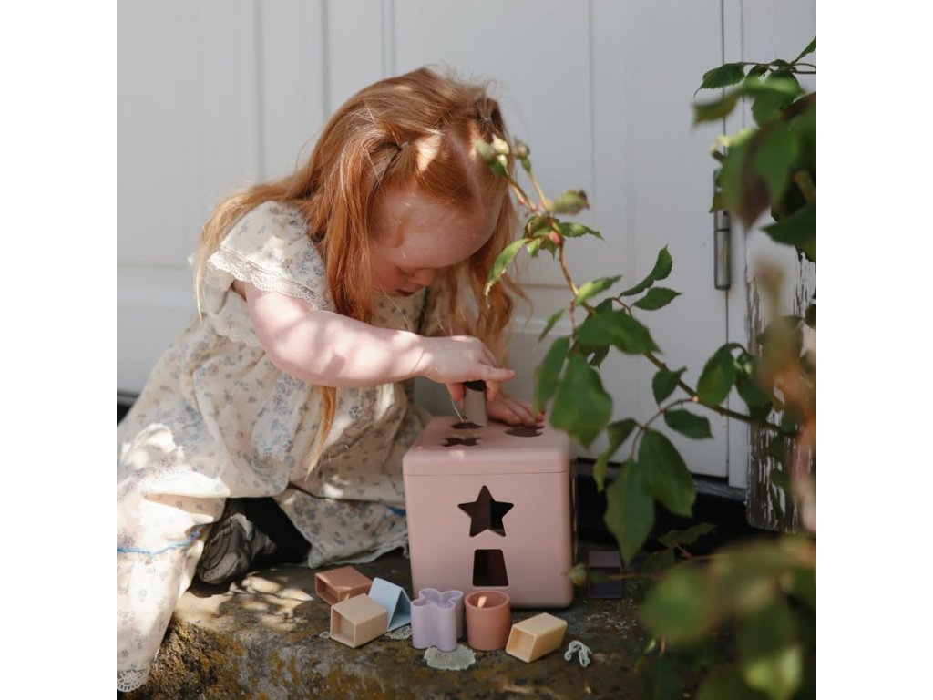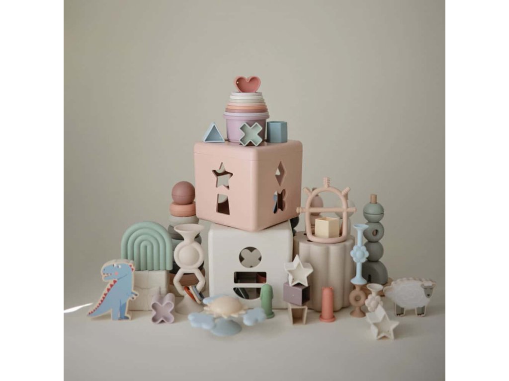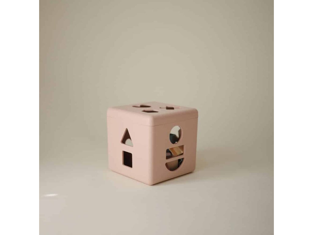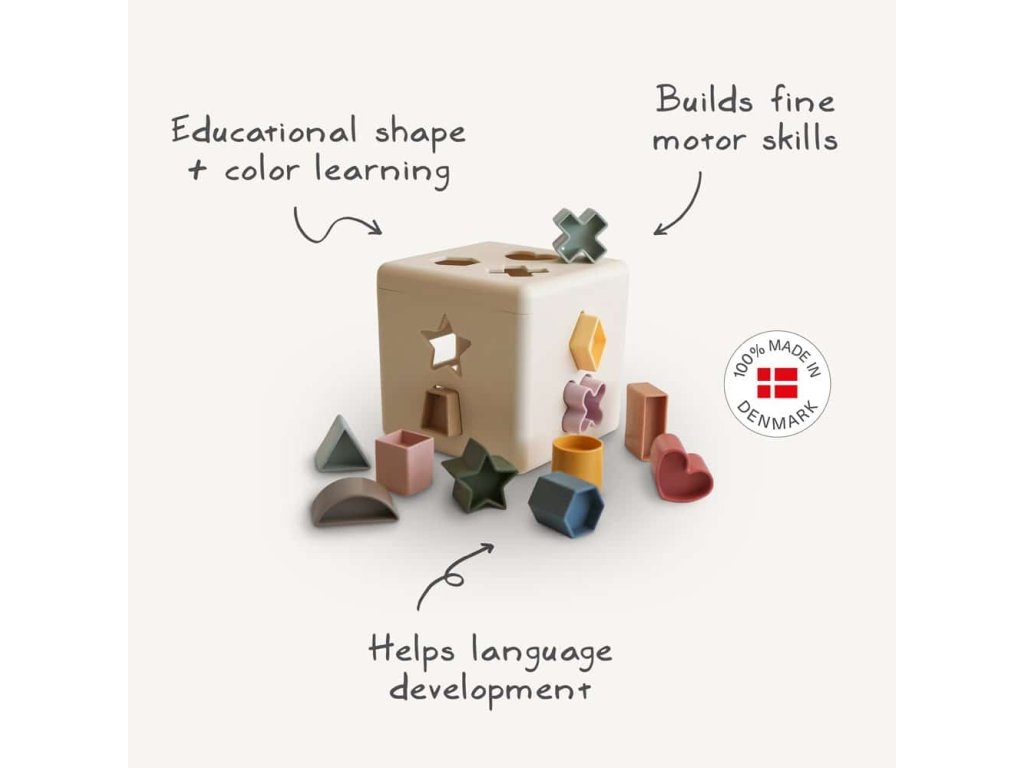 A Mushie Shape Sorting Box játékszer 10 hónapos kortól segíti a gyerekeket a formák játékos megismerésében, fejleszti a koordinációt és a koncentrációt.