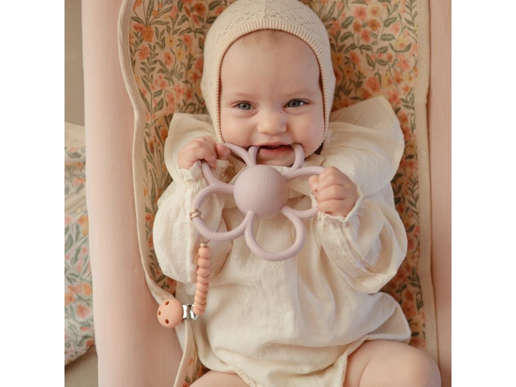A Mushie Hera klipsz tisztítási útmutatója: Kézzel mossa enyhe szappannal és vízzel