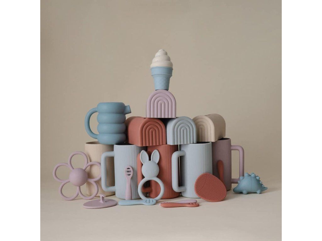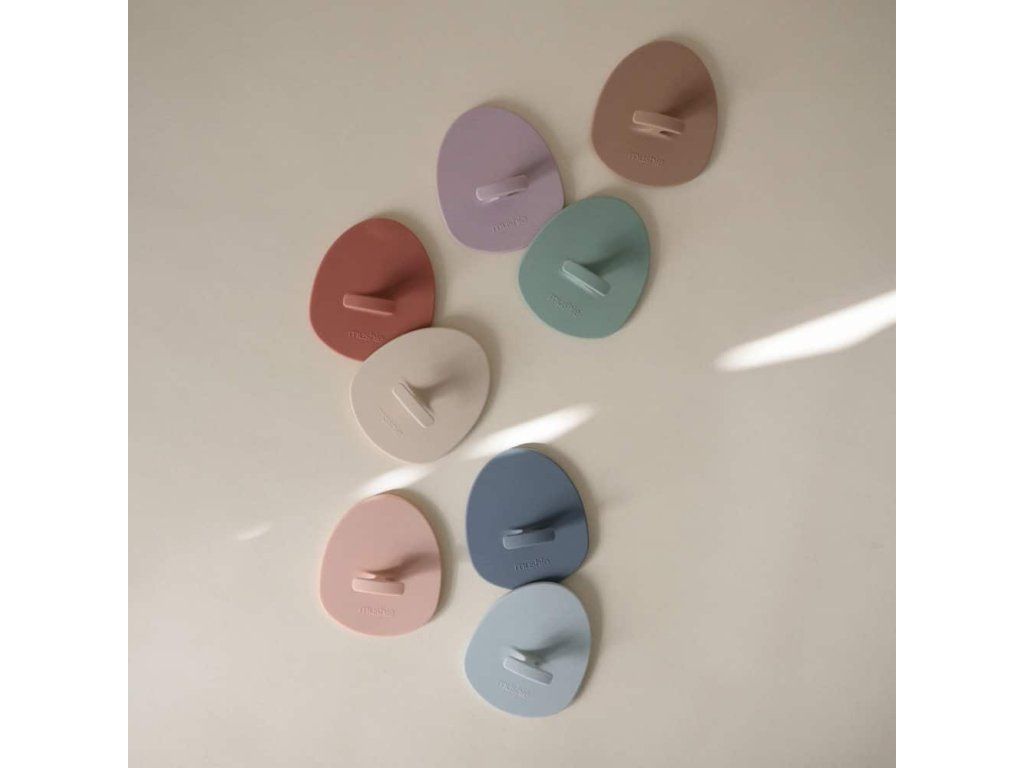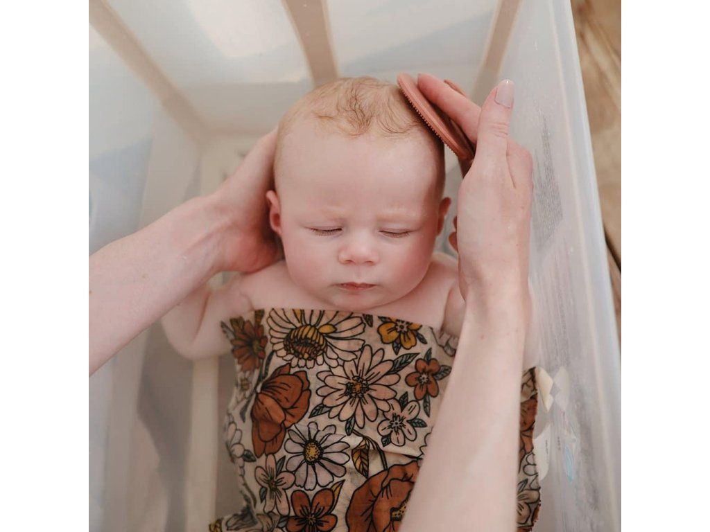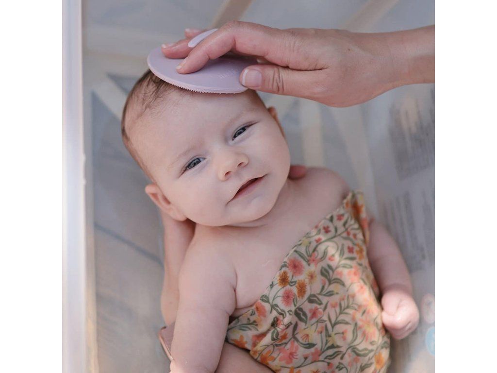 Nyugtató korpa eltávolító kefe csecsemőknek a Mushie-tól, ideális fürdés közbeni használatra.