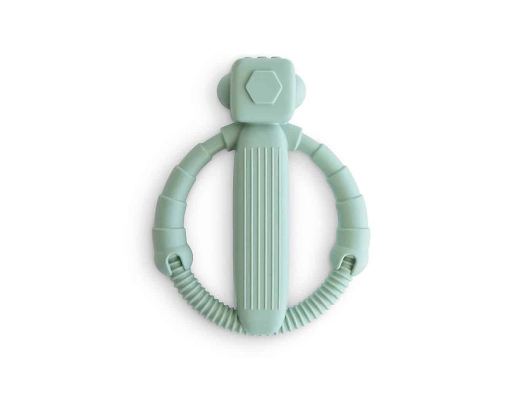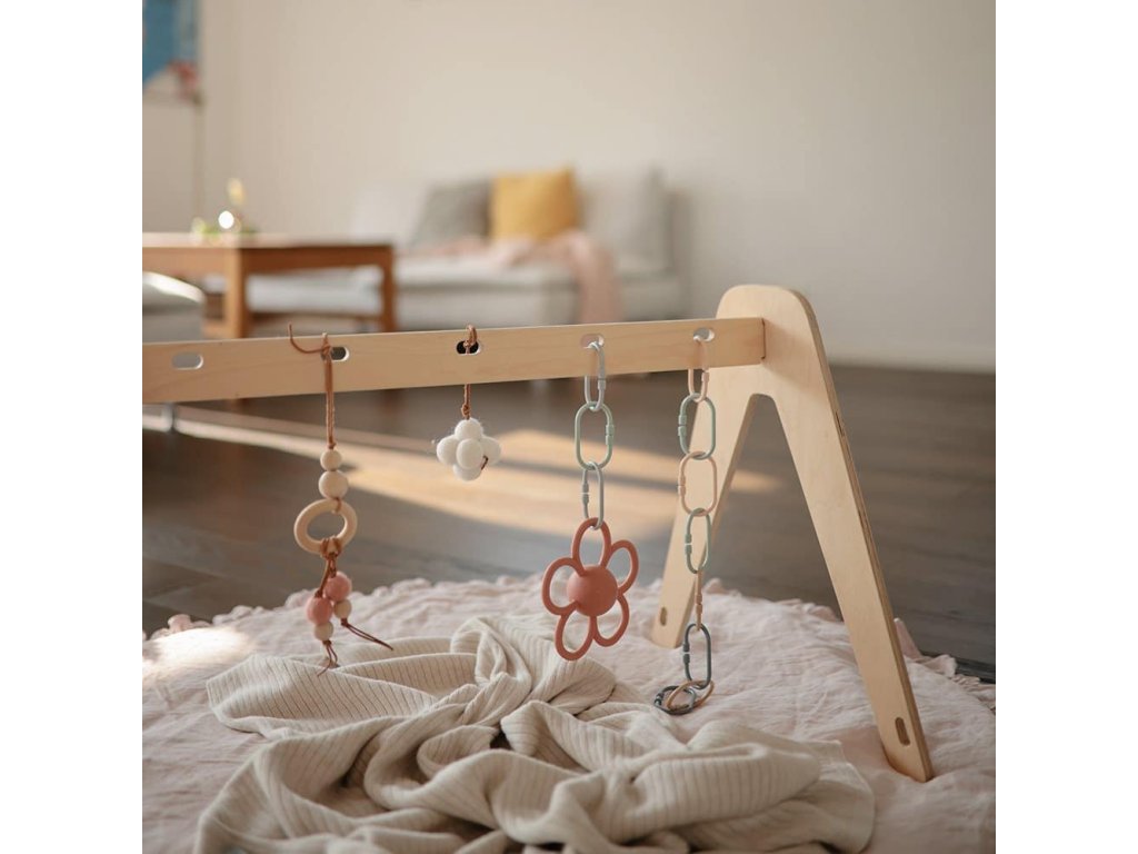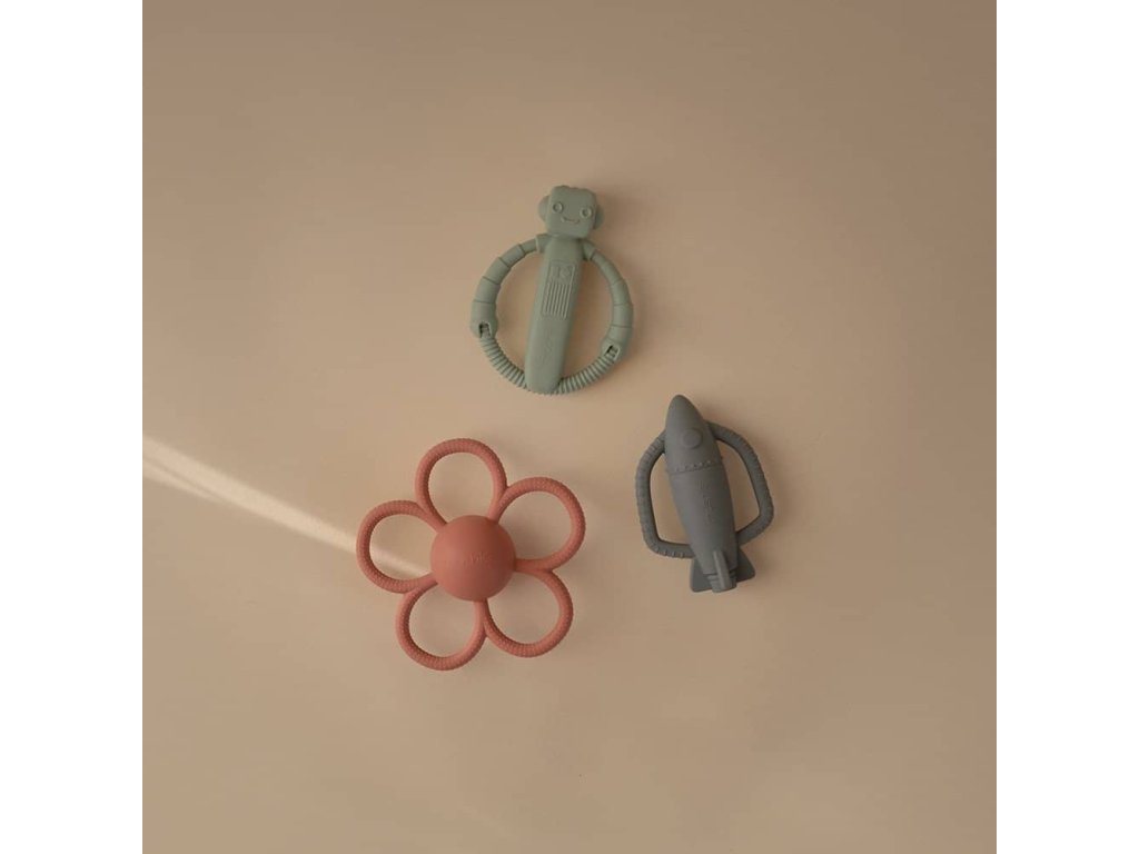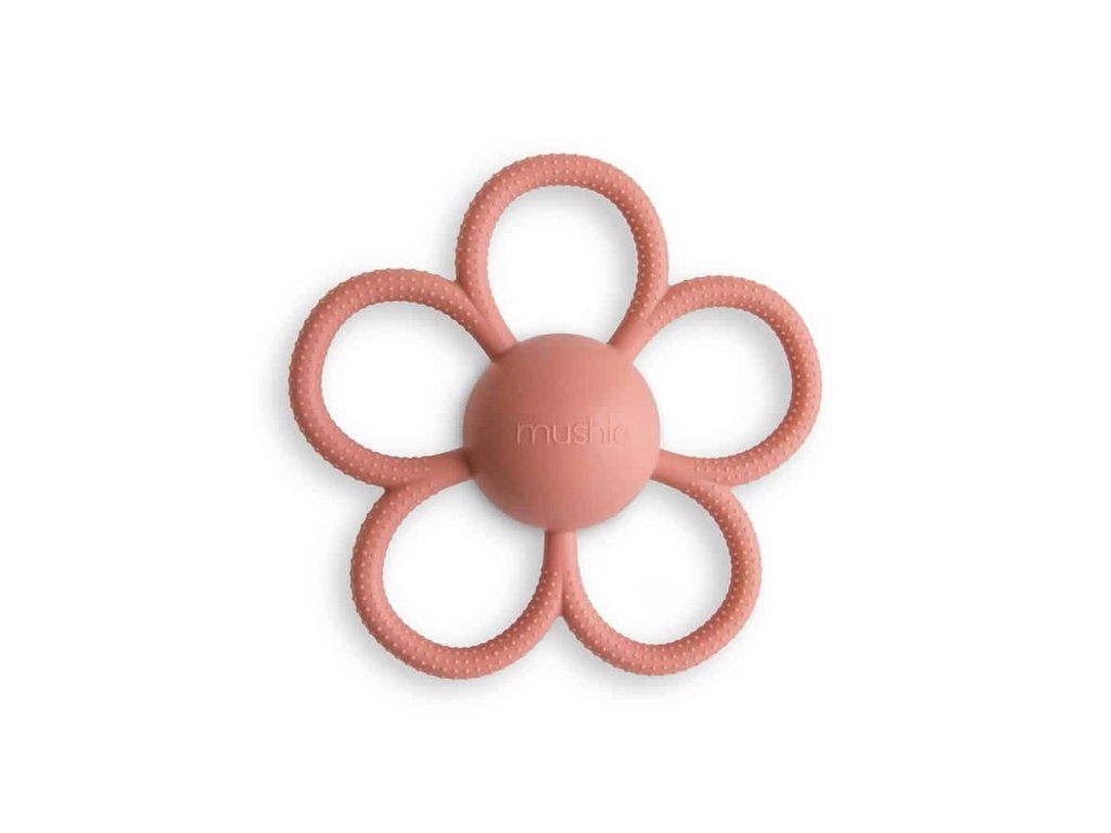 A csörgő egyben rágóka is, minden egyben – a virág alakú játékos design serkenti a hallást, ugyanakkor a kisgyermekek számára könnyen megfogható, és a texturált szilikon felület masszírozza és nyugtatja a baba irritált ínyét, amikor a fogak kibújnak.