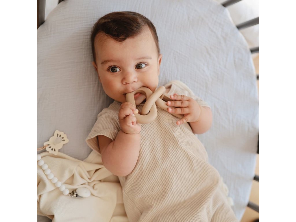 Az egyedi, három összekötő elemből álló rágóka érzékszervi élményeket kínál a gyermekeknek, miközben hatékonyan nyugtatja a fájó ínyüket.