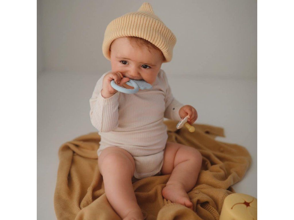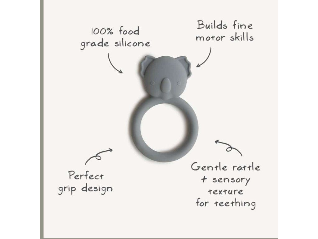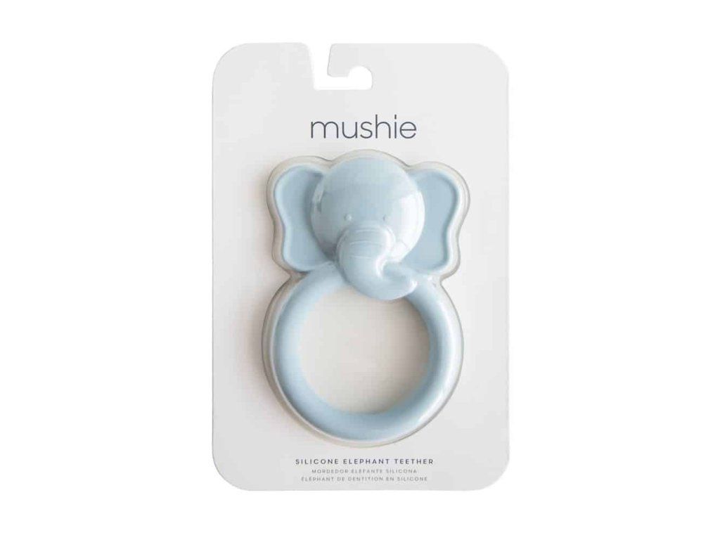 A Mushie élelmiszeripari szilikonból készült rágóka enyhülést nyújt a fogzás idején.