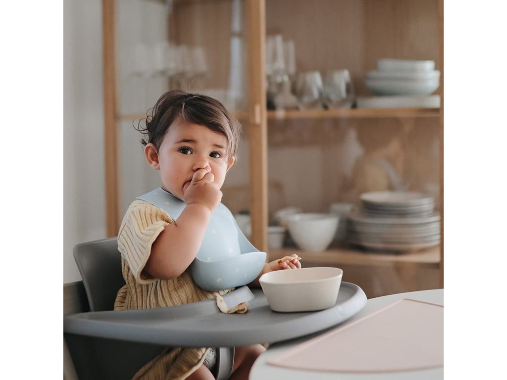 A szilikon előke tisztán tartja a babát és a környezetét: a mély zseb felfogja az ételt, és megakadályozza, hogy rendetlenséget okozzon a padlón és a baba ruháin. A lekerekített, beépített nyakpánt kényelmes viseletet biztosít.