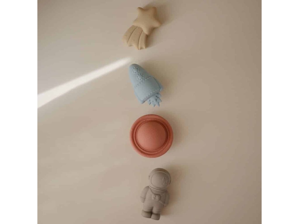 A 4 darabos Space Bath Play Set egy vízbarát játékkészlet, amely biztonságosan használható a fürdőkádban. A készlet 4 kis, űrből merített figurából áll, amelyek élelmiszeripari szilikonból készültek: űrhajós, bolygó, rakéta és üstökös, amelyeket úgy terveztek, hogy serkentsék a gyermekek érzékeit és támogassák kognitív fejlődésüket.