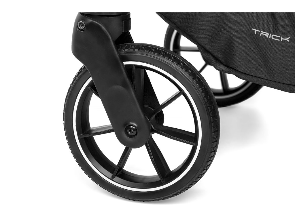 A Trick nagyméretű, gél, karbantartást nem igénylő kerekekkel és kiegészítő téli lábzsákkal van felszerelve. A babakocsi egy mozdulattal előre és hátra is összecsukható.