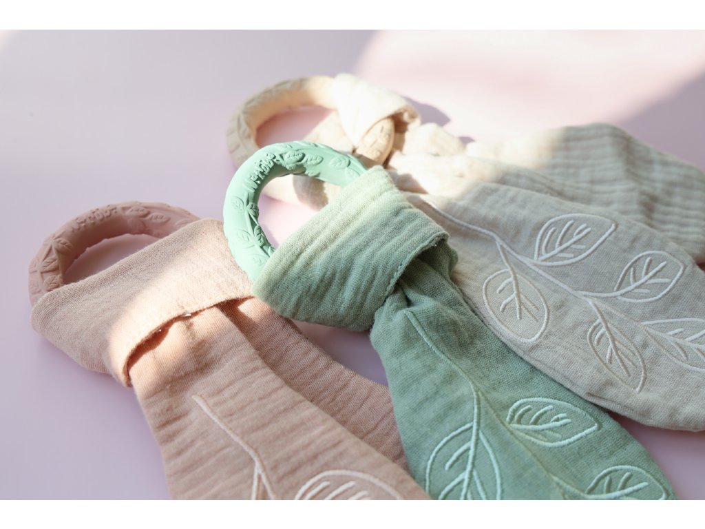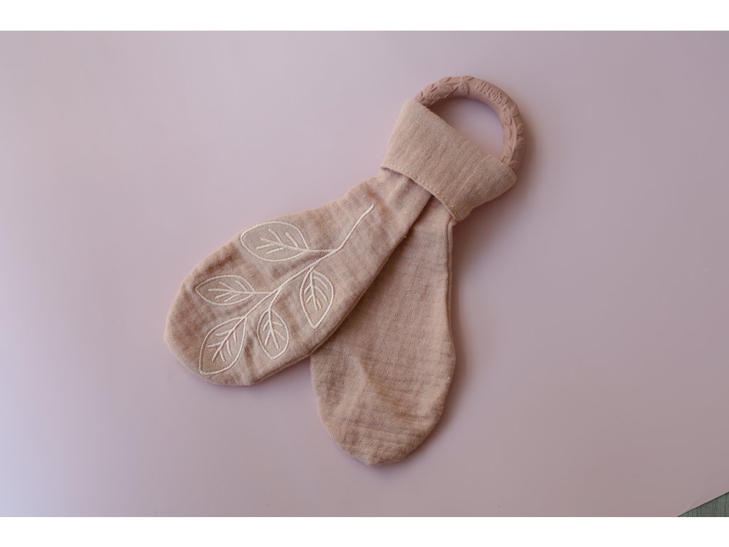Rágóka Muszlin Rózsaszín Aranyos, szép és praktikus játék 3 az 1-ben A harapójátékunkkal, tevékenységekkel a gyermeke cumit, rágókát és játékot is kap az összes érzék fejlesztéséhez! Púder finom organikus muszlin pamutból és természetes gumiból készült, a levelek egyikében pedig ropogó papír található a hallás érzékének serkentésére. A természetes gumi gyűrű a levelek mintázatával ellátott gyönyörű textúrának köszönhetően serkenti a tapintást, az ízérzéket és a szaglást is, mivel a természetes guminak természetes gumi illata van. A muszlin levelek egyikén levelek hímzett mintája található, amely serkenti a látást, és mindezek a tevékenységek együtt serkentik a szem-kéz koordinációt és a finommotorikát.Aktiválja gyermeke kíváncsiságát. A második muszlin levél mintázat és gyűrött papír nélküli, csak puha organikus muszlinból készült, ami örömet okoz a babának. Ezenkívül a puha és rugalmas, levélmintás természetes gumi gyűrű megnyugtatja a babát és segít a fájó ínyen. A természetes gumi gyűrű és a muszlin könnyen szétválaszthatók.Tesztelve és tanúsítva 0+ hónapos kortól használható.Méretek:Természetes gumi gyűrű: Ø7Csörgő: M: 8 cm x H: 20 cm.Kombinált: H: 25 cm