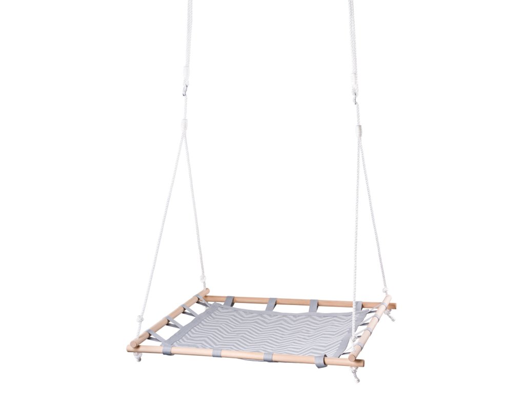 A lengő négyzet fából készült kerettel rendelkezik. A belső rész gumírozott textilből készült, ami csak növeli az időjárási hatásokkal szembeni ellenállást. Az egyszerű, kifinomult kialakítás garantálja, hogy a hinta nem lesz zavaró elem a kertjében és a belső tereiben. | Kor:3+ | Méret: 100x100 (zsinór hossza 190-266 cm)