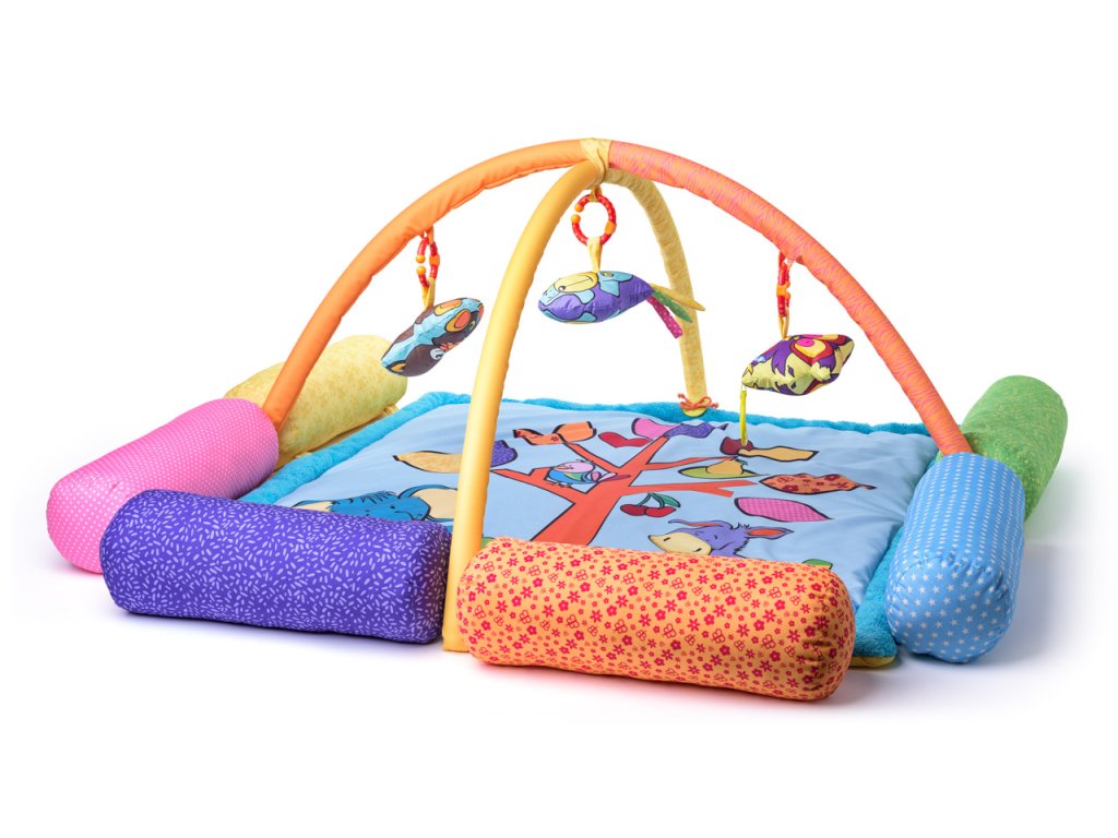 A játékaréna levehető, hengerek alakú párnákkal van felszerelve. Ezek a párnák levehetők, és maga a takaró is használható. A karám feletti rúdra állatok vannak akasztva, amelyeket a gyerekek figyelhetnek, és amelyek felé nyújtózkodva erősíthetik a hasizomukat. Ez a rúd szintén szétszedhető. Ezt az arénát Britta Hurter német tervezőnő tervezte. | Életkor: 0+ | Méret: 96 x 96 cm | Maga a játéktér mérete: 90 x 90 cm