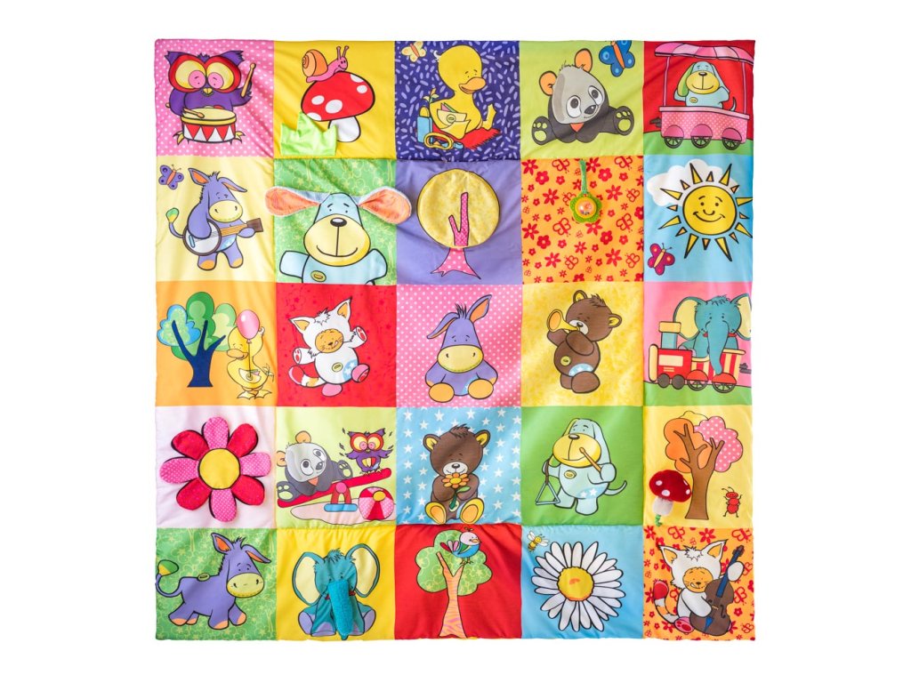 Tágas patchwork stílusú játszószőnyeg számos játékelemet kínál, amelyek az egyes képekbe vannak beépítve. A sziromlevelek, a kutyus fülei, a cicus farkincája és a fű zöld csomója is sercegő papír hangot ad, ha megnyomják. Az elefánt ormánya és a légyölő galócát sípoló hanggal látták el. A zöld virág alakú csörgő szirmai egyben rágókák is. Amikor felfelé hajtja a sárga fa koronáját, felfedi a biztonsági tükröt, amelyben a gyermek meglátja az arcát, és lelkesen reagál rá. Ez a szerzői mű az Art&Copyright cégnél van regisztrálva a 200-16-20-1 szám alatt, keltezése 2020.11.10. Takaró méretei: 150 x 150 cm. Életkor: 0+ | Videó: https://www.youtube.com/watch?v=3IKPGRhapAA