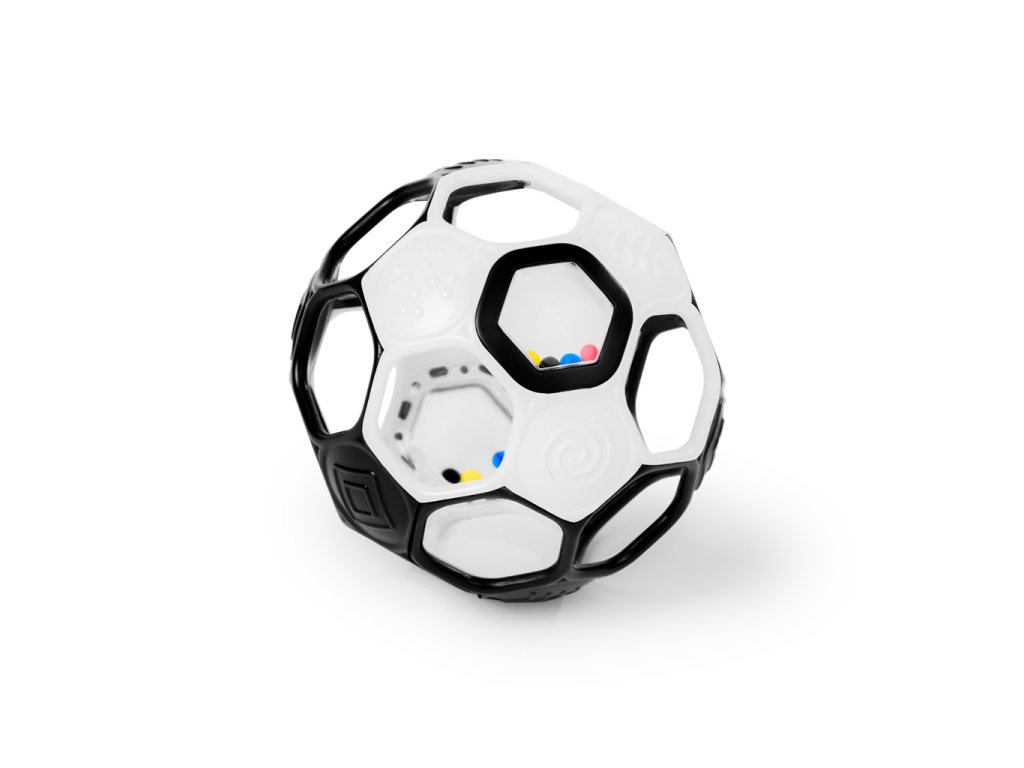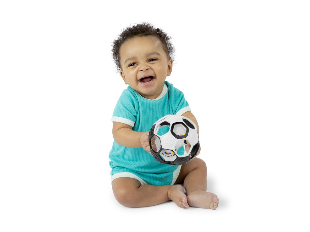 FEJLESZTI A FINOMMOTORIKÁT: A Grippin' Goals labda könnyű megfogása megkönnyíti a baba számára a csörgő tartását és rázását, ezzel támogatva a finommotoros készségek fejlődését.